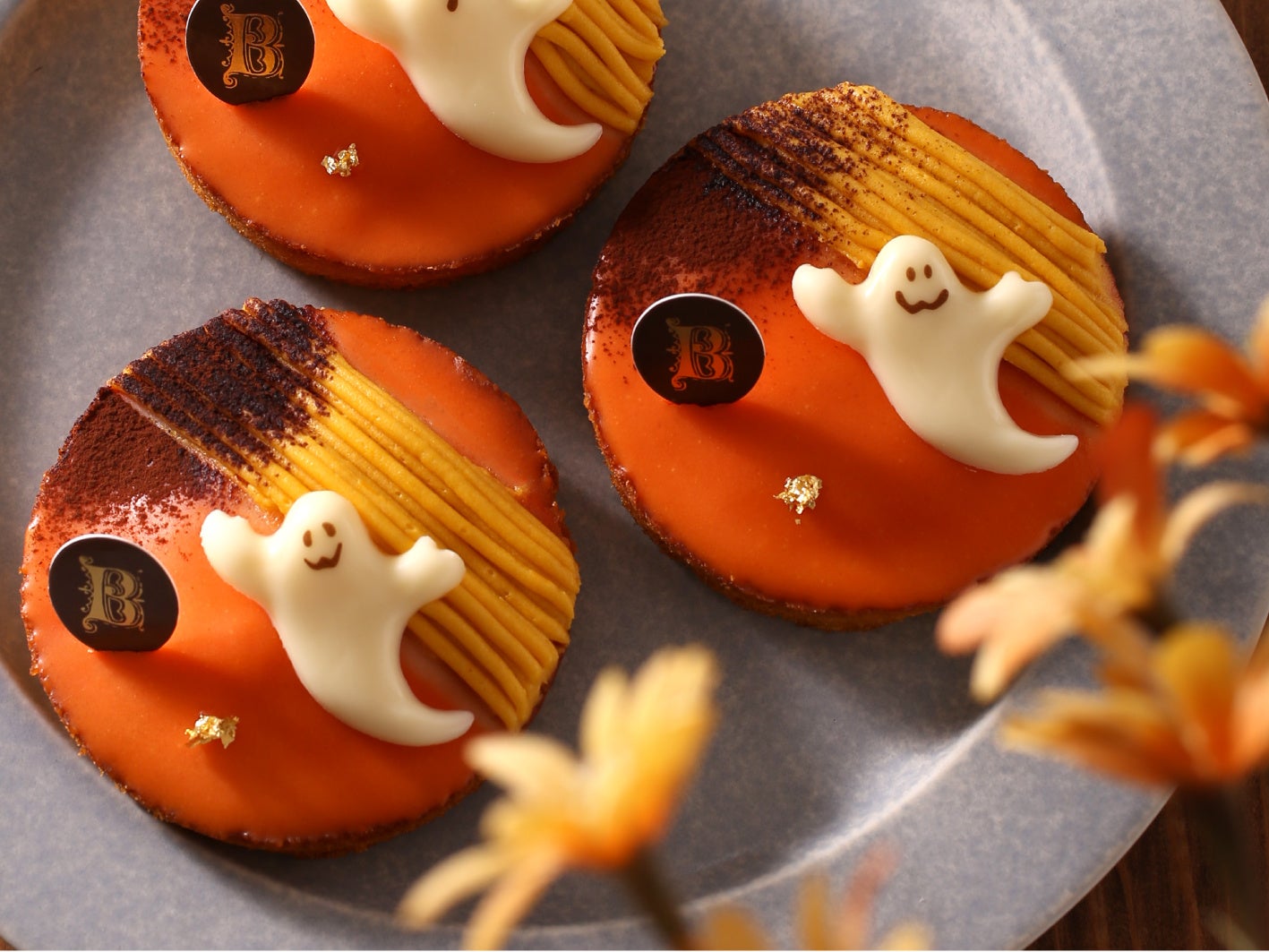 発酵バターの風味豊かな生地にかぼちゃパウダーを加えて焼き上げ、かぼちゃの甘みが広がるクリームを絞った濃厚なかぼちゃの味わいがお楽しみいただけるガトー・ナンテに仕上げました。ハロウィンカラーのアイシングとホワイトチョコのおばけを飾って。