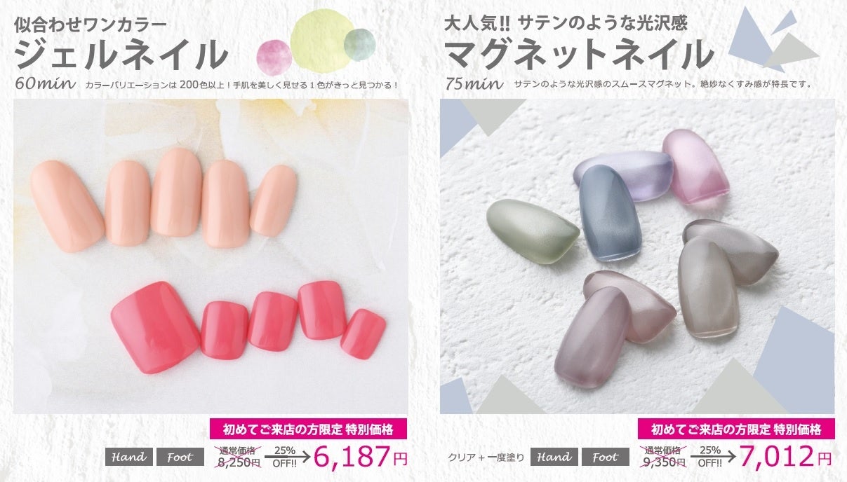 ※ワンカラージェルネイル、マグネットネイルは、ファイリング・ドライケア・クリームトリートメントを含む