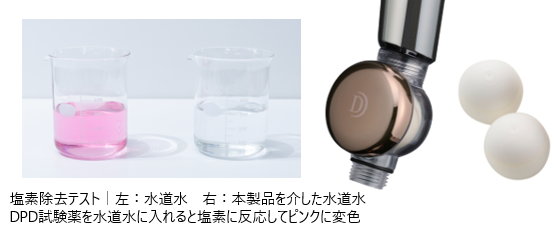 塩素除去カートリッジ&ビタミンボール(別売り)が水道水の残留塩素を99.9%除去。ビタミンCが水道水中の塩素と反応し、塩素による刺激から髪や肌を守ります。