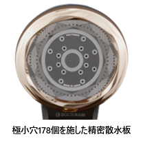 高機能シャワーヘッドに求められる節水・保温・保湿効果はもちろん、アラミックの独自技術による約0.3mmの極小の穴を178個配置した精密散水板によって、高水圧による高い洗浄力と肌あたりが滑らかなシルキータッチ水流の両方で、肌に優しい満足度の高い体感を実現。