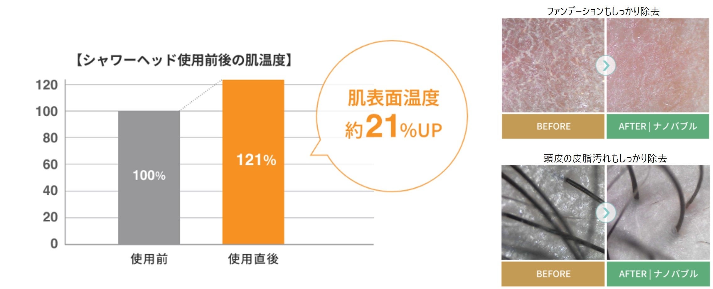 また、毛穴より小さいナノバブル水が肌や頭皮へ浸透することによる保湿・保温効果で、シャワー後の肌がしっとり潤います。