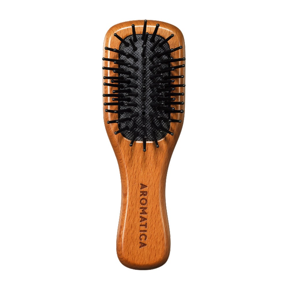 耐久性に優れたヨーロッパ産ピーチウッド(ブナの木)を使用。ブラシ先端のボールチップとふわっとしたクッションヘッドがストレスでコリ固まった頭皮ともつれた髪をやさしくほぐします。持ち運びやすいミニサイズでポーチに入れてどこでもブラッシングできます。