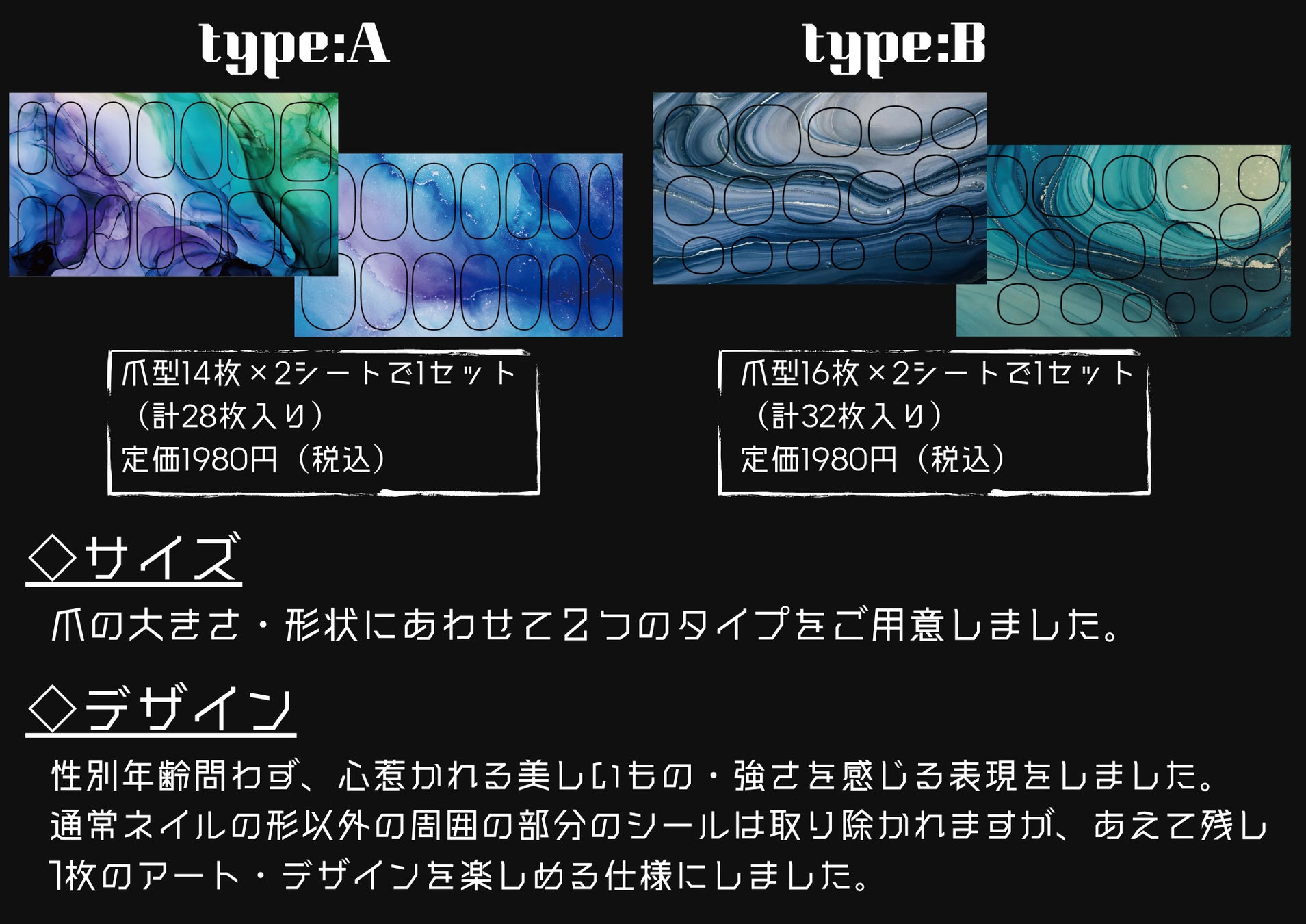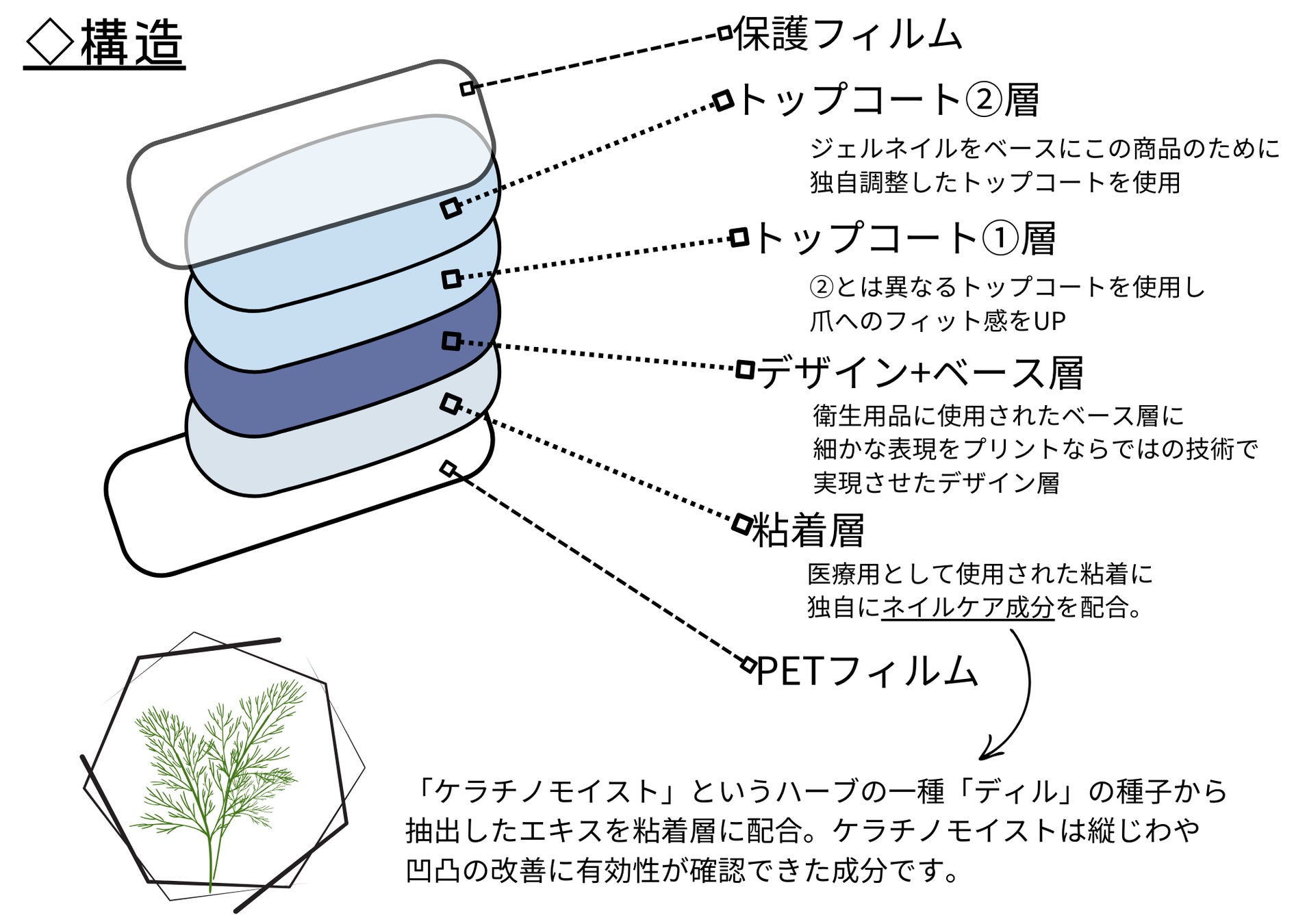 UV/LEDライトで硬化する仕様のため、トップコート②は市販ジェルネイルを製造している企業にてトップコートジェルをベースに ステッカーとして半硬化にできるよう、この商品のために独自に調整を行いました。