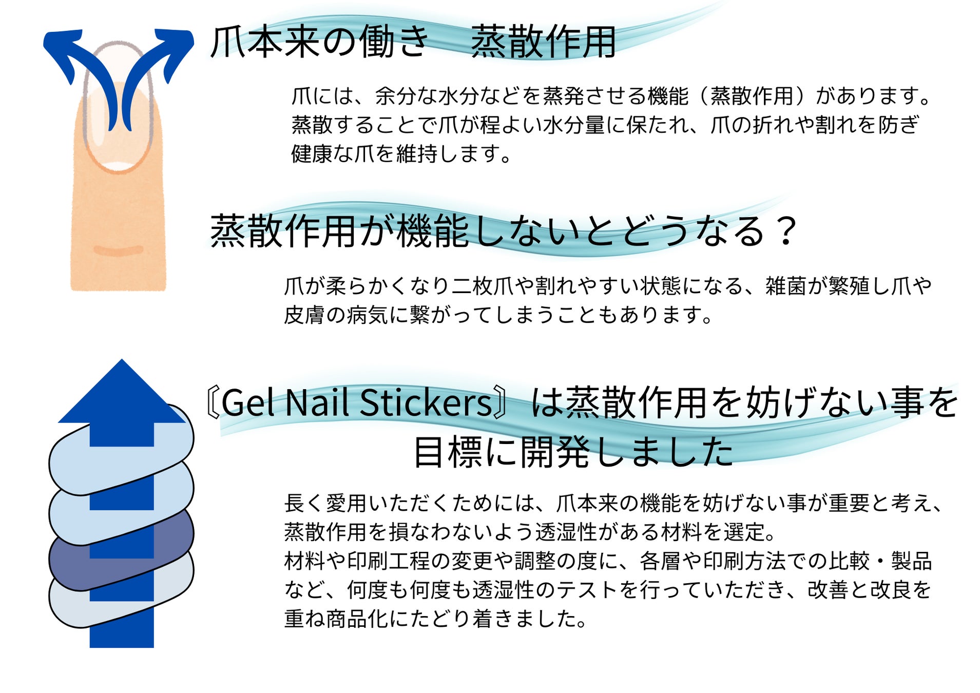 Gel Nail Stickersは貼ることによって爪の乾燥しすぎを抑えつつ、爪自体が本来持っている蒸散を妨げないよう透湿性がある材料選定と工程で、 貼っているのに自然な爪に近い、を目標に商品開発を行いました。