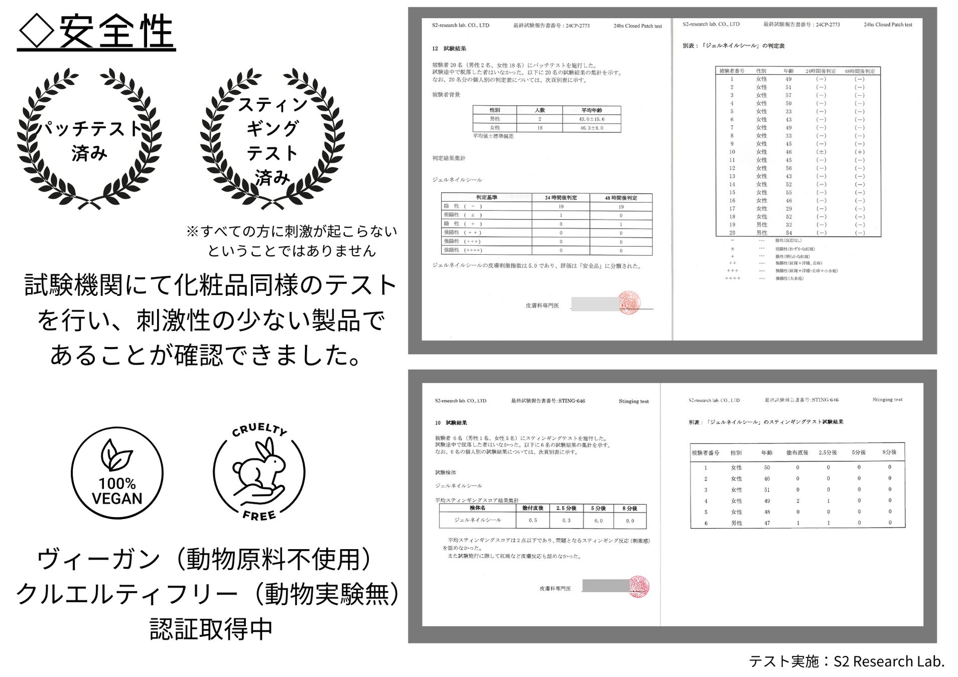 両試験共に規定上、爪に貼っての試験ではなく皮膚に貼っての試験となったものの、安全性が確認できました。 また、動物を原材料とせず、開発のために動物実験を行っておりません。 ヴィーガン認証、クルエルティフリー認証については現在申請中です。