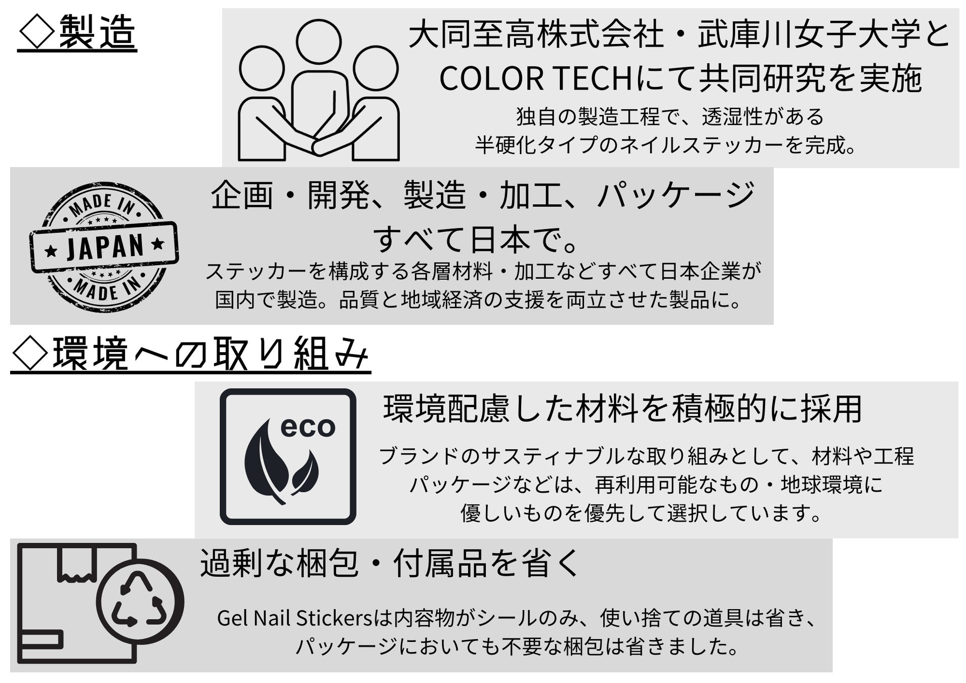 また、市販のジェルネイルシールに付属されるプレップパッド、ウッドスティック、爪やすりは商品ごとに付属は不要ではないか、 ネイルケアアイテムが無くとも家庭にあるもので代用できるのではないか、と考えGel Nail Stickersは内容物がシールのみとなっています。