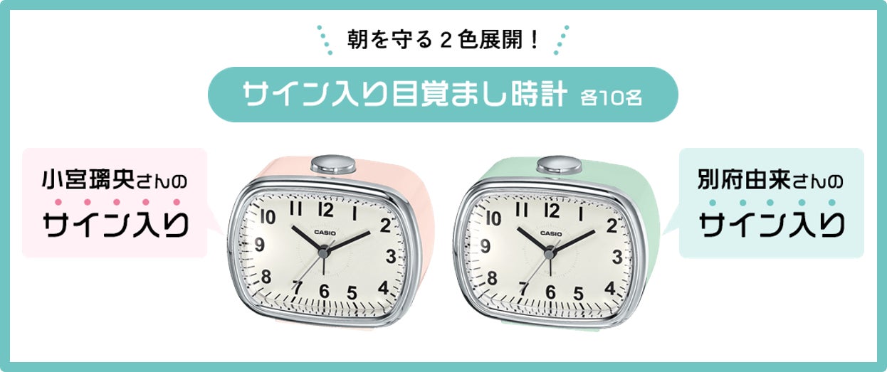 [総計20名様]に抽選で、「小宮璃央さん・別府由来さんのサイン入り目覚まし時計」をプレゼント!(※6)
