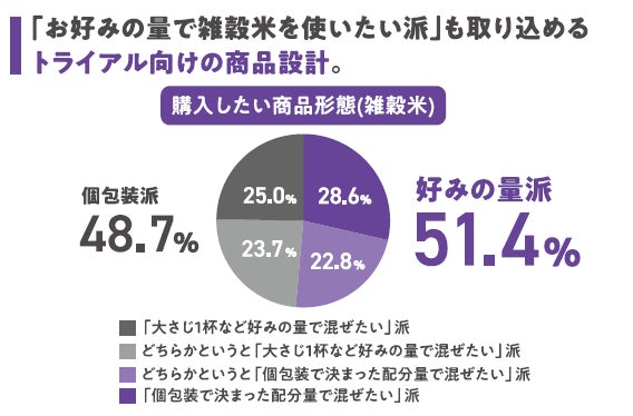 ブレンドしている穀物が異なるため、食感や炊き上がりの色合いにそれぞれ特長があり、お好みに合わせて選びやすいのが嬉しい点です。雑穀を初めて購入される方でも迷わず、安心してお選びいただけるよう、パッケージデザインの「わかりやすさ」にもこだわりました。