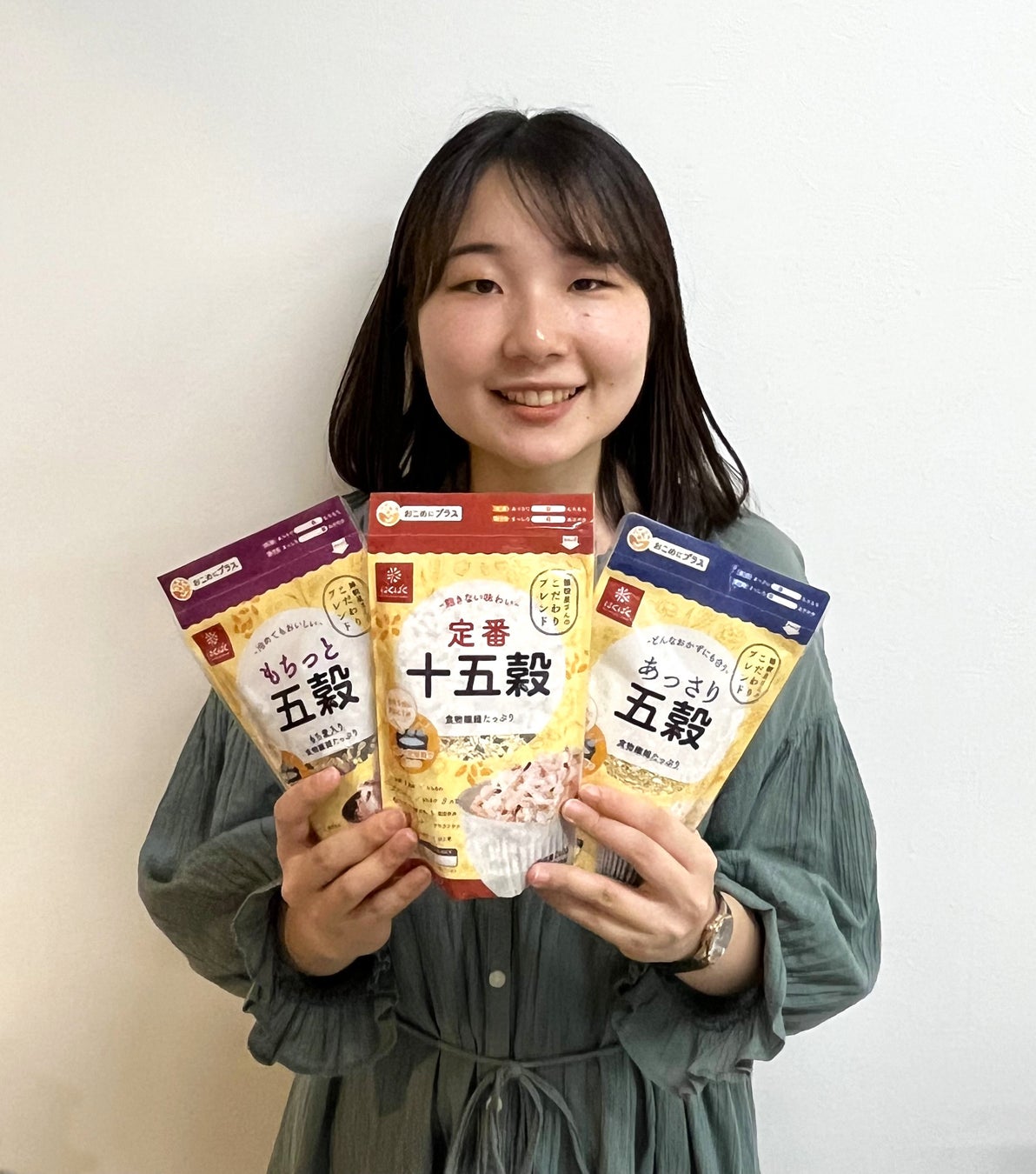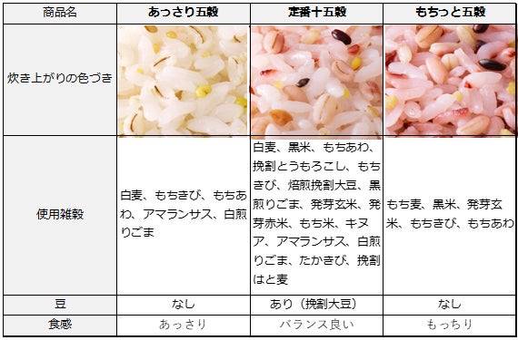 見た目や食感が白米に近く、どんなおかずとも合わせやすい「あっさり五穀」、雑穀らしい色付きやもちっと食感が楽しめる「もちっと五穀」、そしてバランスのとれた飽きない味わいの「定番十五穀」の3品展開です。