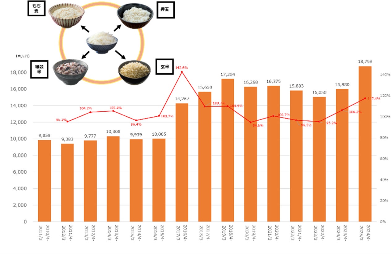 近年の健康意識の高まり、腸活市場の活性化を背景に、主食であるおこめに健康的な穀物をプラスする「おこめにプラス」市場は過去10年で約1.9倍に伸長をし、2024年の市場規模は昨年対比17%増の成長を遂げています。※3