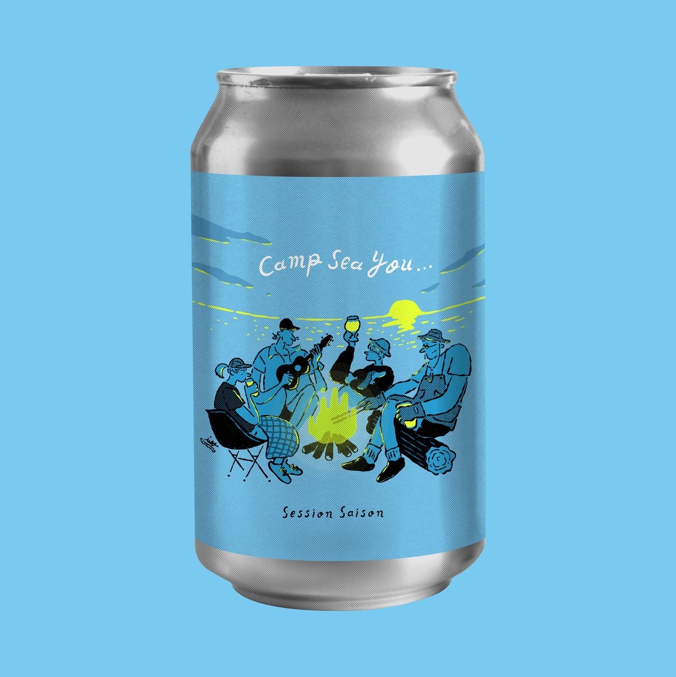コラボビール「Camp Sea You-Session Saison-」は「横浜ビール」で最もキャンプを愛しているヘッドブルワー井⽥ 章⼀と、ウクレレシンガー宮 武弘を中⼼に、アウトドア好きなメンバーでキャンプをしながら考えた、外に出掛けて皆で飲みたくなるビールです。⽸ビールのラベルデザインはイラストレーターのイソガイヒトヒサ。キャンプ中に焚き⽕を囲んでいる「横浜ビール」のブルワー3⼈と、ウクレレを奏でる宮 武弘が描かれています。