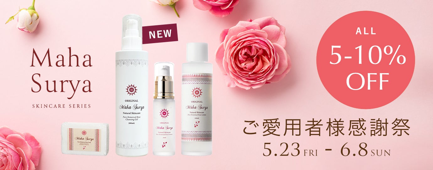 5月23日(金)〜6月8日(日)までの期間、Maha Suryaスキンケア全ての商品が5〜10%割引となる、ご愛用者様感謝祭を実施いたします。