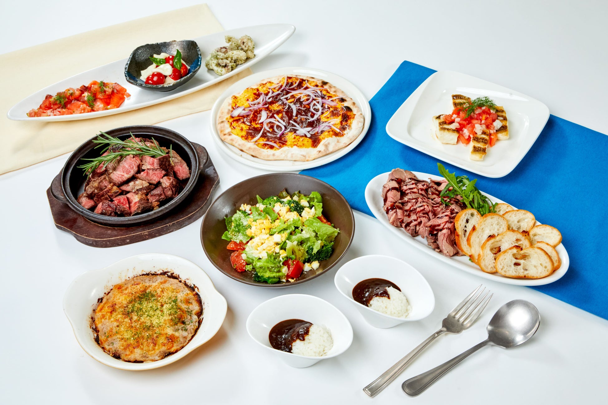 牛肉のステーキを食べ放題&6種のトッピング/ローストビーフとガーリックトースト/前菜3種盛り合わせ/トマトとブロッコリーのミモザサラダ仕立て/カルボナーラ風 ピッツァ/白身魚のソテー フレッシュトマトのソース/長芋のパルマンティエグラタン/アゴーラ黒カレー/シャーベット
