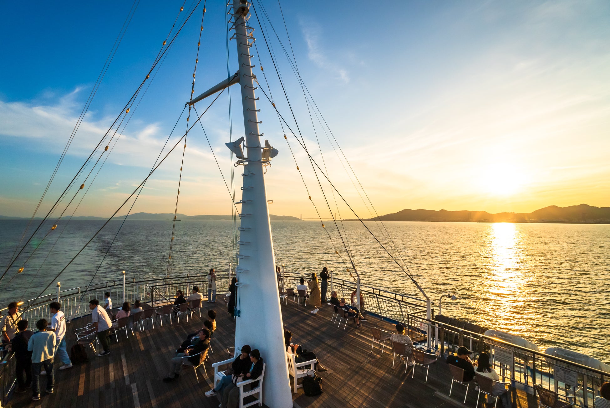 空を赤く染めて明石海峡大橋に沈む夕陽を楽しみたい方は17:00〜のトワイライトクルーズ、赤やピンク、ブルーなどまるで宝石箱のようにカラフルな夜景を満喫したい方は19:15〜のナイトクルーズがおすすめです。