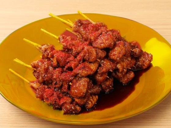 おらが蕎麦名物のとり皮串に、ピリっと辛いニンニク風味のタレを絡ませました。おいしくて手が止まらず、気が付けば何本も。