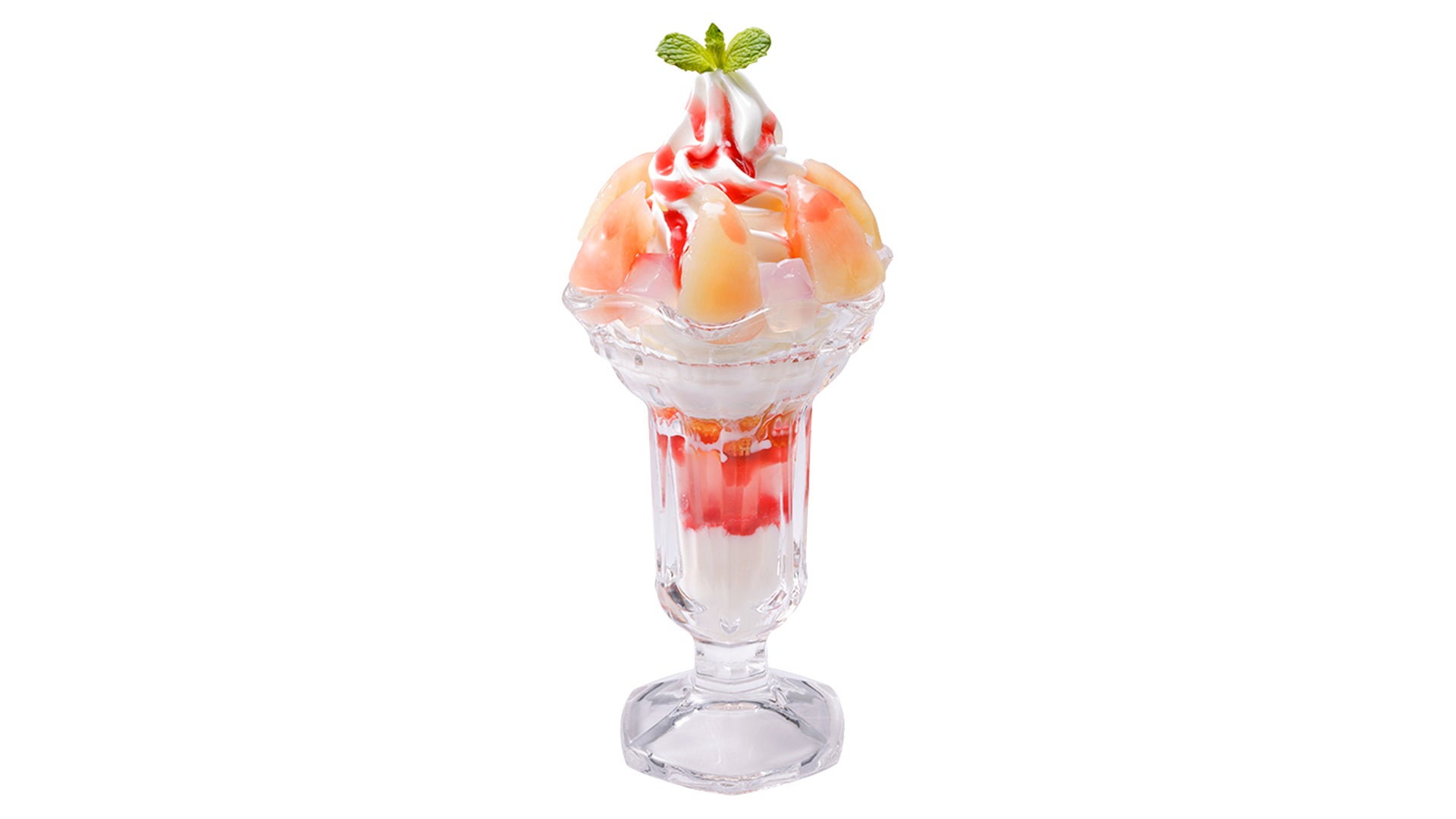 北海道ソフトクリームの周りにナタデココとジューシーな白桃のシロップ漬けをふんだんにあしらった華やかな仕上がりに。中にはピーチゼリーと杏仁が入っており、味、香り、食感の三拍子が揃ったパフェとなっています。