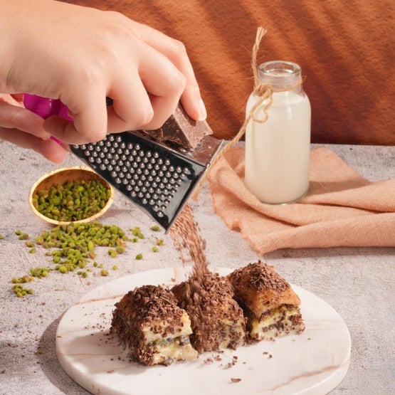 ナーディル・ギュルの看板商品<ピスタチオバクラヴァ>を、北海道産牛乳に浸し、仕上げにベルギー産チョコレートフレークをトッピング。