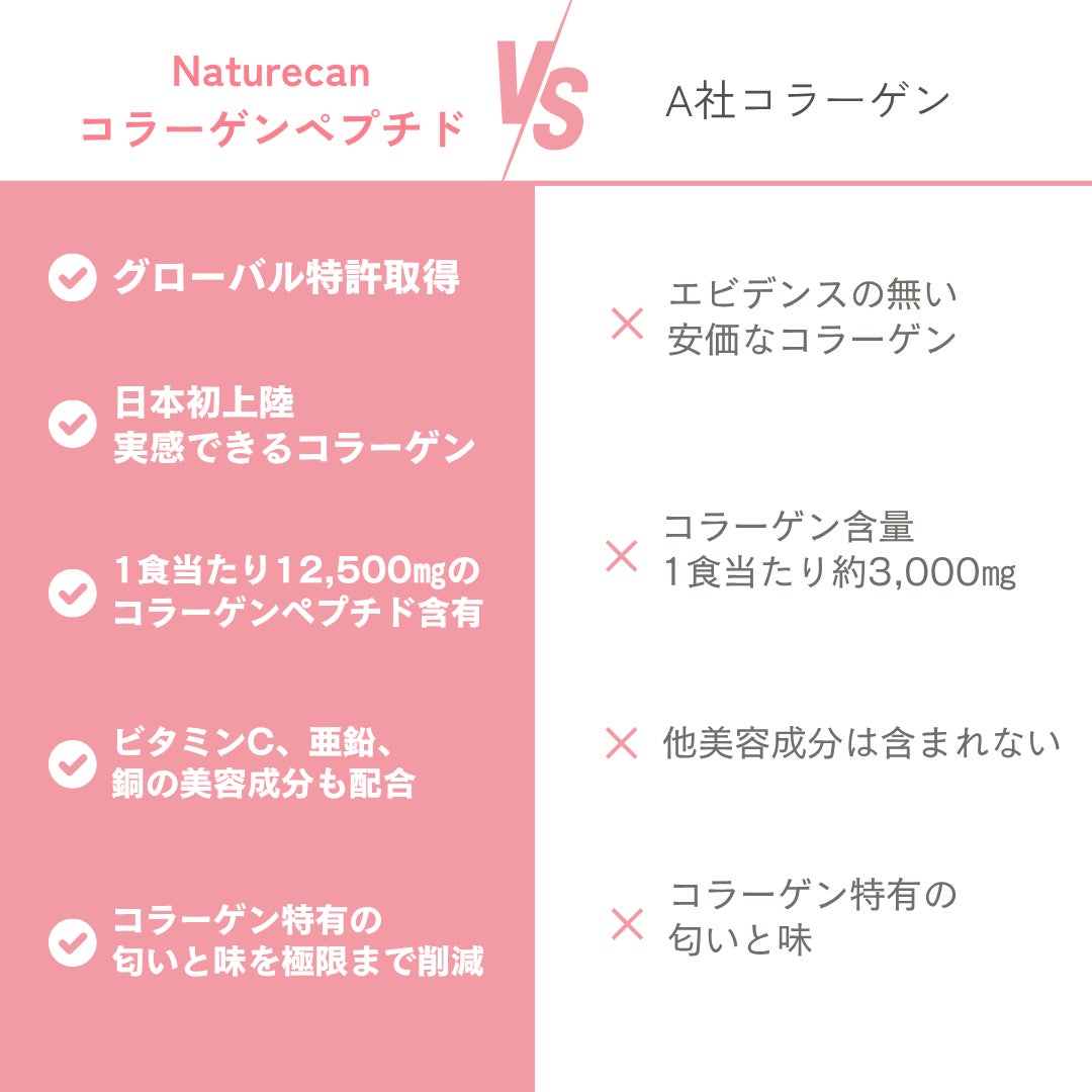 Naturecanのコラーゲンペプチドには、1食分あたり12500mgのコラーゲンペプチドに加えて、亜鉛・ビタミンC・銅の3種類の美容成分を配合。
