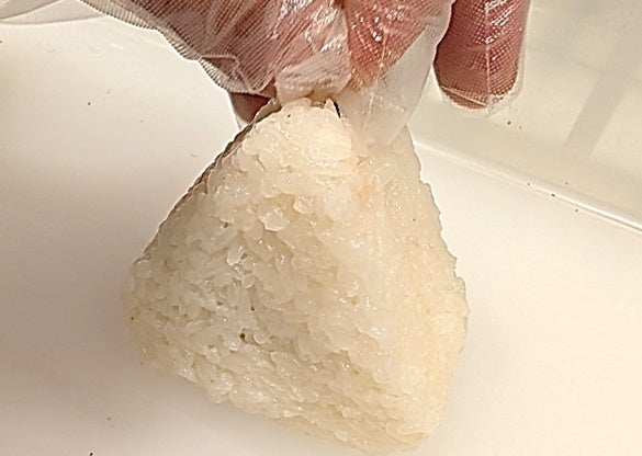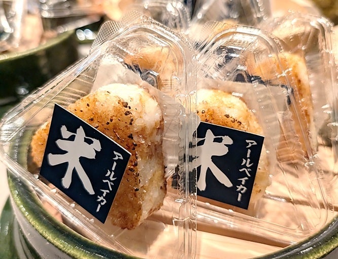 R Bakerが生地作りの工程でブレンドしている炊いたお米は、山形県産のブランド米・つや姫を使用。R Bakerでは山形県が県産米の消費拡大を通じて取り組んでいる、県内の農業経営の安定化並びに食育・地産地消プロジェクト“米粉チャレンジ”に参加しています。中でもブランド米「つや姫」の米粉の普及に努めていることも、今回のおにぎり開発のきっかけになりました。生地作りに使用しているお米にはもち米もブレンドしているため、焼きあがったパンはしっとりもちもちの食感になります。このもち米もブレンドしたおにぎりにすることで、もっちりと柔らかく、冷めても美味しい状態のおにぎりが完成。ピザを焼くコンベアオーブンを使って、「焼きおにぎり」も提供いたします。