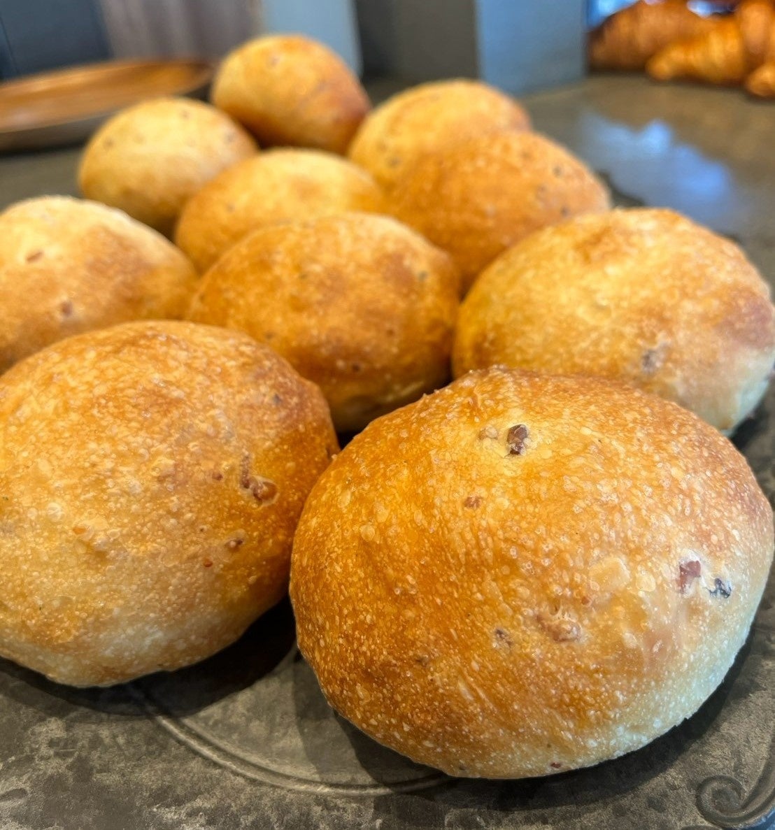 一方パンの生地には、炊いたお米だけではなく、黒米・赤米・緑米・玄米などの古代米も混ぜ合わせています。お米の粒が生地に混ざっているのが焼き上がりのパンからも見て取れます。栄養価が高い古代米を使用することで健康効果だけではなく食感もお楽しみいただけます。