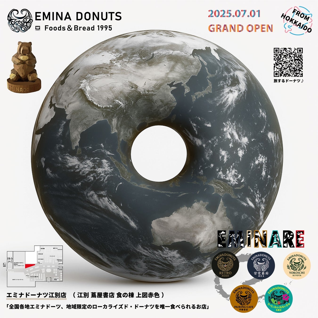 本店舗は、全国のローカライズドEMINA DONUTS限定ドーナツが江別に集結します。エミナドーナツの全てを集めた唯一を味わえる特別な店舗であり、地域特性を活かした「商品展開」、さらには地域に喜ばれる「パン教室」や「食の体験イベント」も常時開催予定です。
