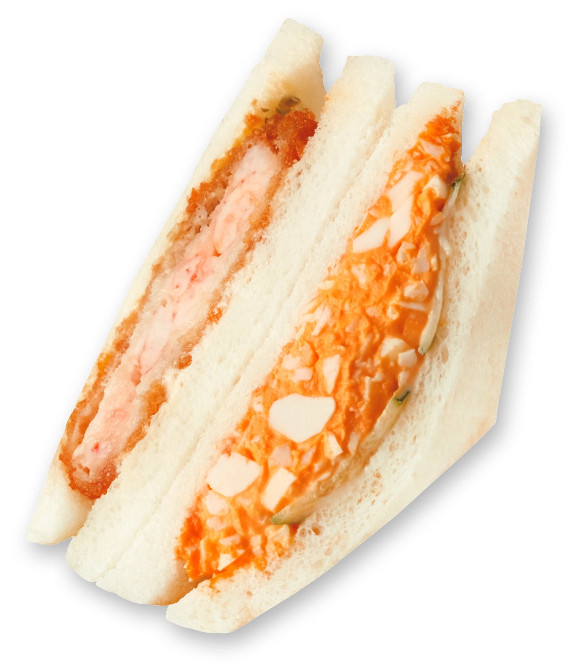 タルタルソースで仕上げたぷりぷり食感のエビカツサンドと人気のたまごサラダサンドを組み合わせました。2つの味のサンドイッチが楽しめるのも人気です。
