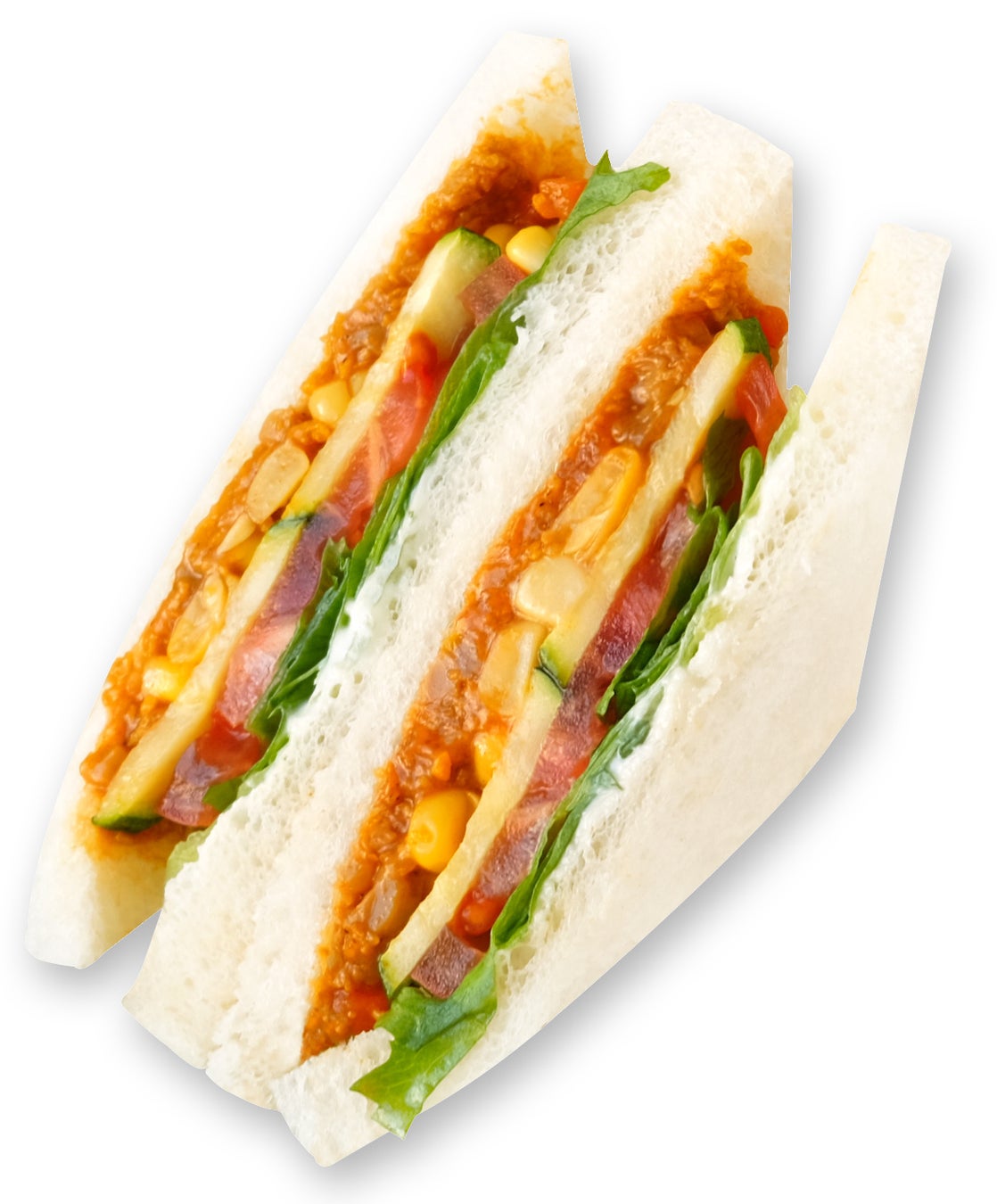 大豆ミートを使ったキーマカレーに、ズッキーニ・コーン・トマトなどの夏野菜を合わせた、彩り豊かなサンドイッチ。ピリッとスパイスのきいたドライカレーと、シャキッとしたレタスの食感が相性抜群。暑い季節にうれしい、旨みと爽やかさのバランスが光る一品です。