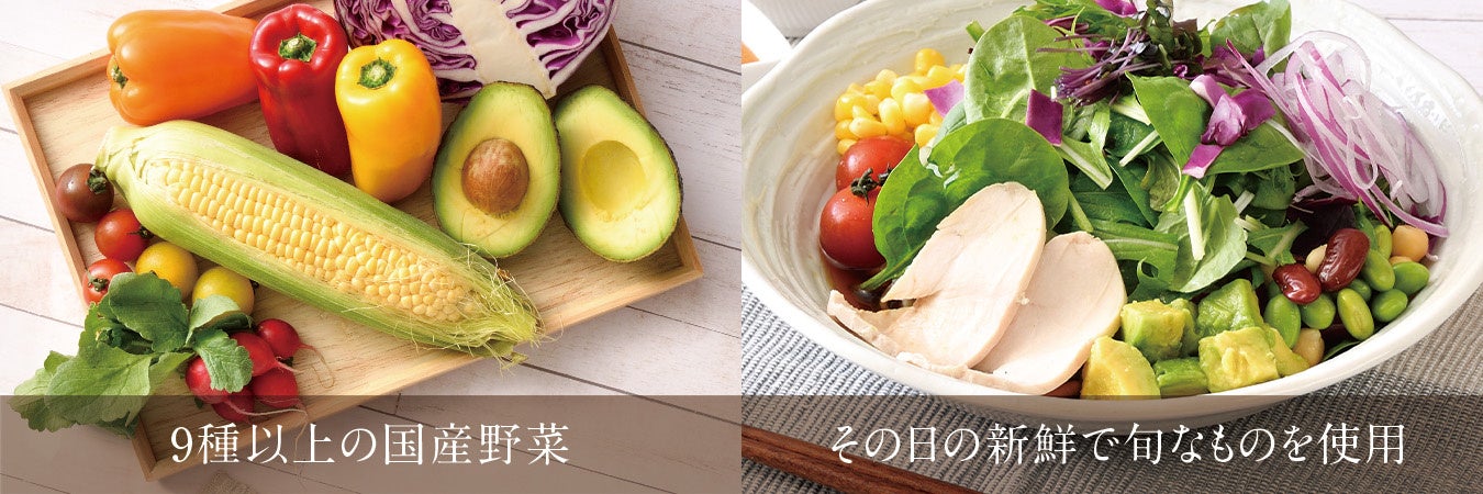 9種類以上の新鮮な野菜を並盛180g、野菜大盛はその1.5倍