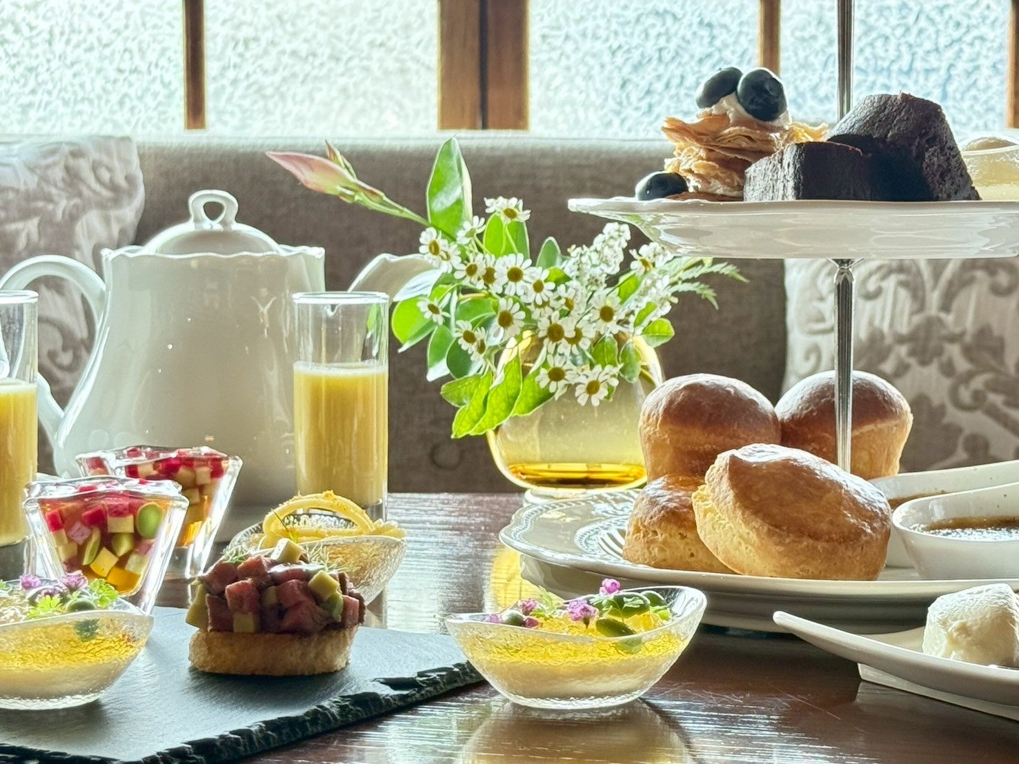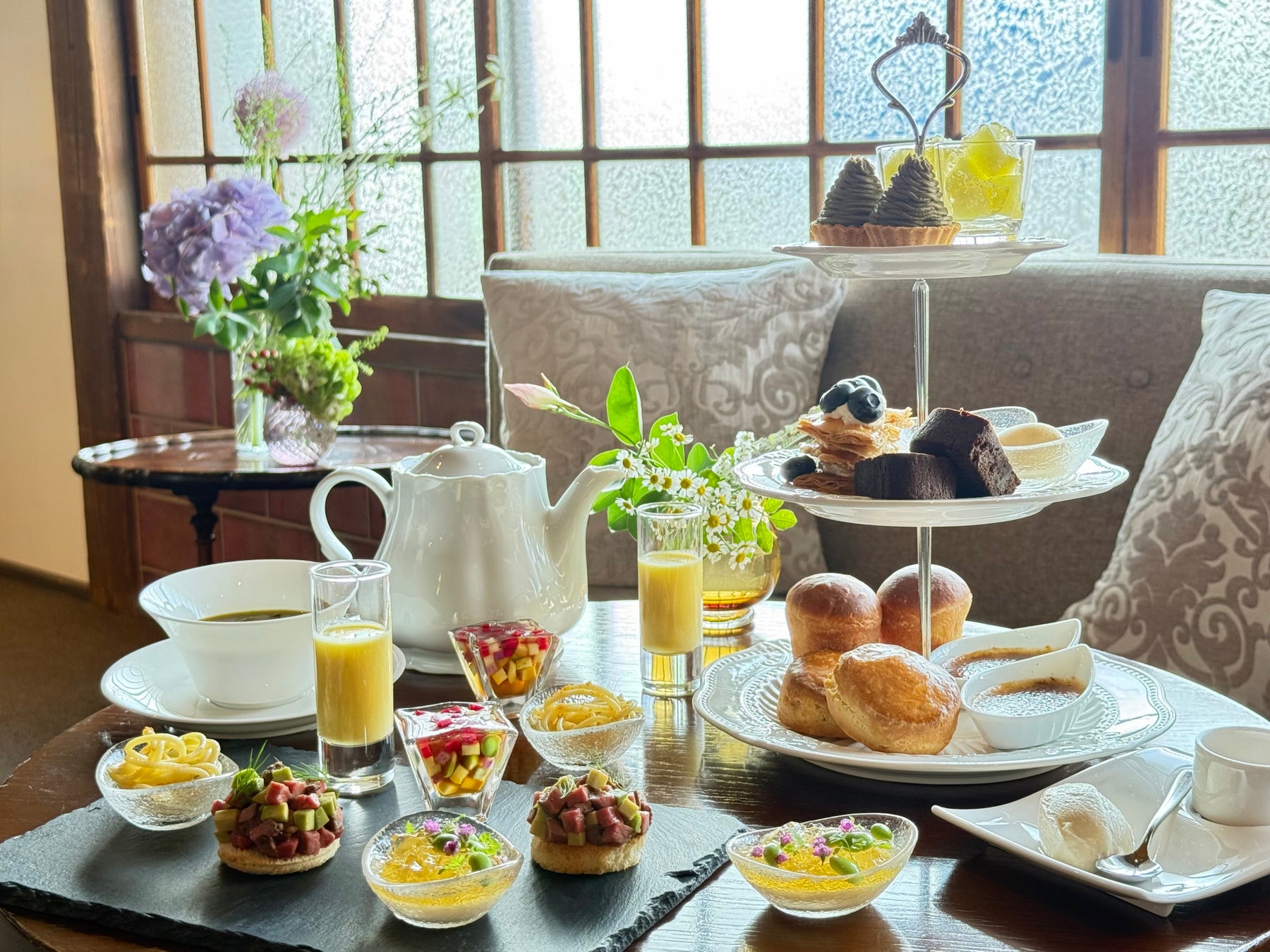 セイボリー6品、スイーツ6品、ブリオッシュとスコーンを含めた全14品に厳選されたコーヒーと紅茶をセットして、4,000円(税サ込)でご提供。大正15年建造の元執務室を改装した大正ロマンの空間で非日常的でゆったりとした時間をお過ごしください。