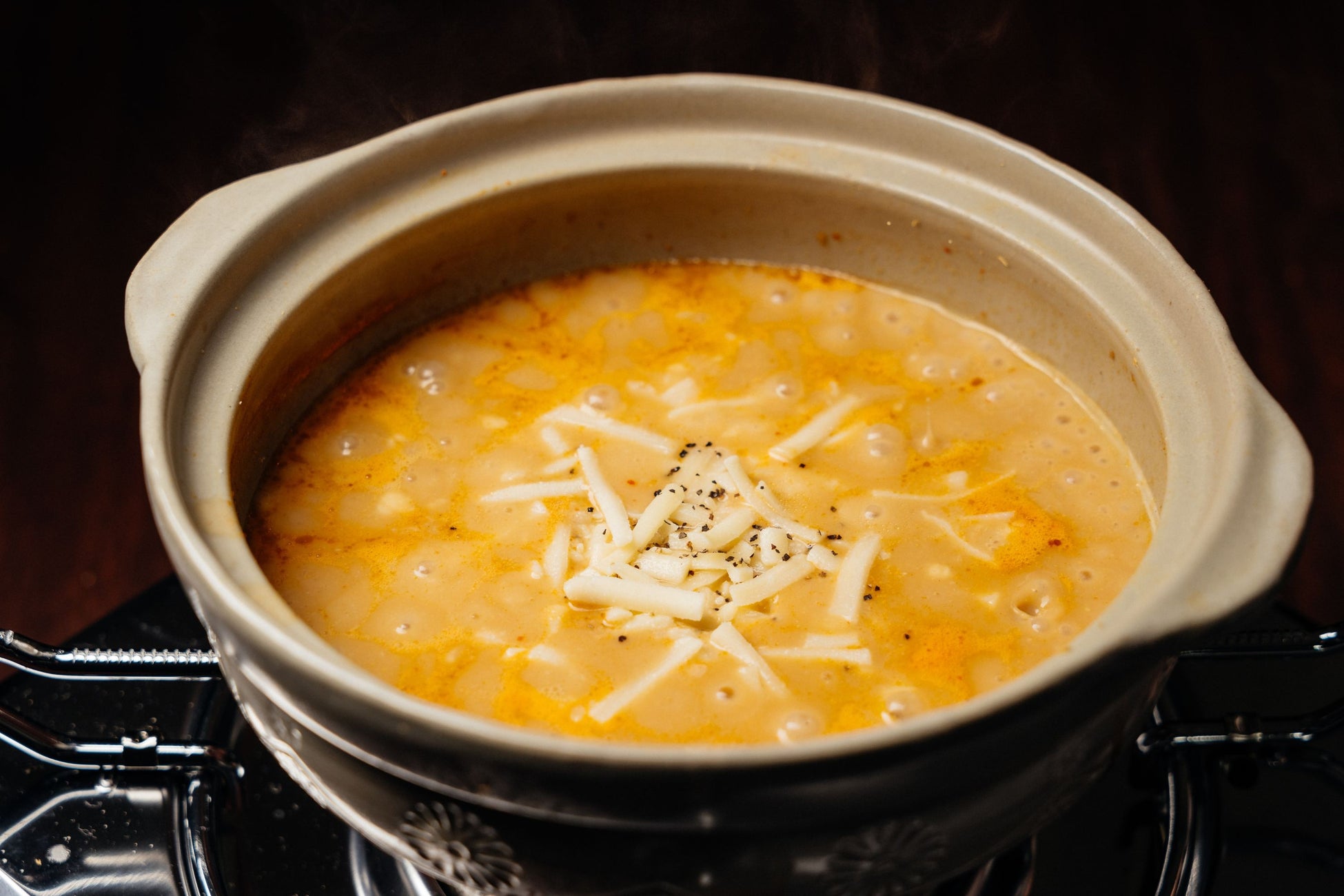 鍋のスープにご飯を加え、とろけるチーズをたっぷりのせます。仕上げにブラックペッパーをかけてお召し上がりください。