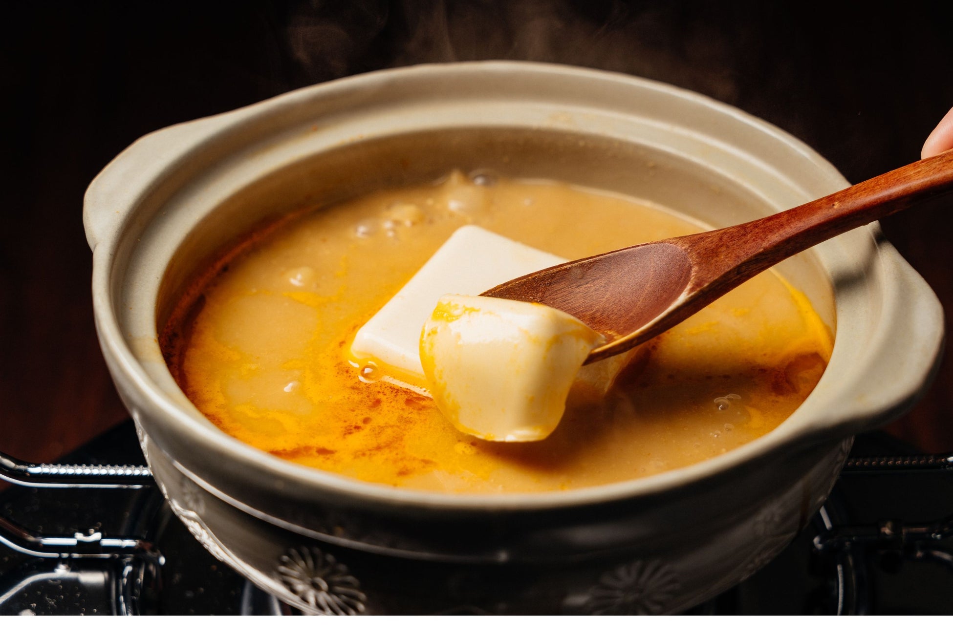 鍋の終盤に、絹ごし豆腐を1丁丸ごと投入。1分ほど経ったら、ほのかな冷たさと甘みを、ピリ辛スープでお楽しみください。