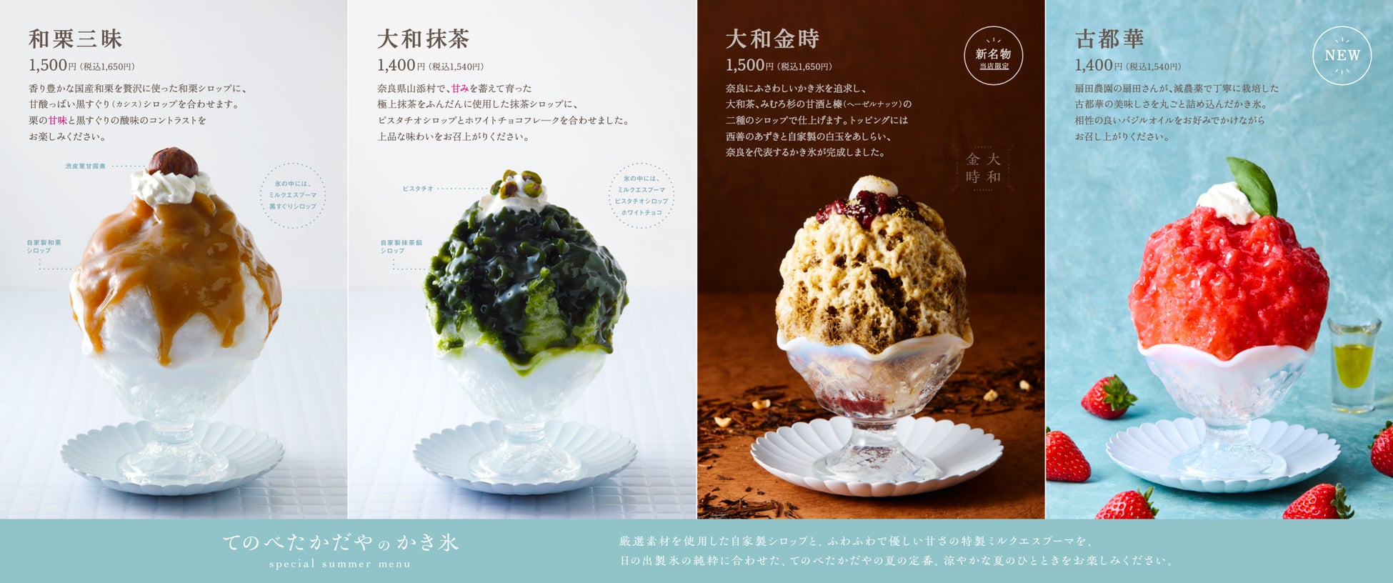 店舗では、今年も「大和かき氷」シリーズが発売開始しております。厳選素材を使用した自家製シロップと、ふわふわで優しい甘さの特製ミルクエスプーマを、奈良市唯一の製氷業者である日の出製氷の純氷に合わせた、てのべたかだやの夏の定番です。