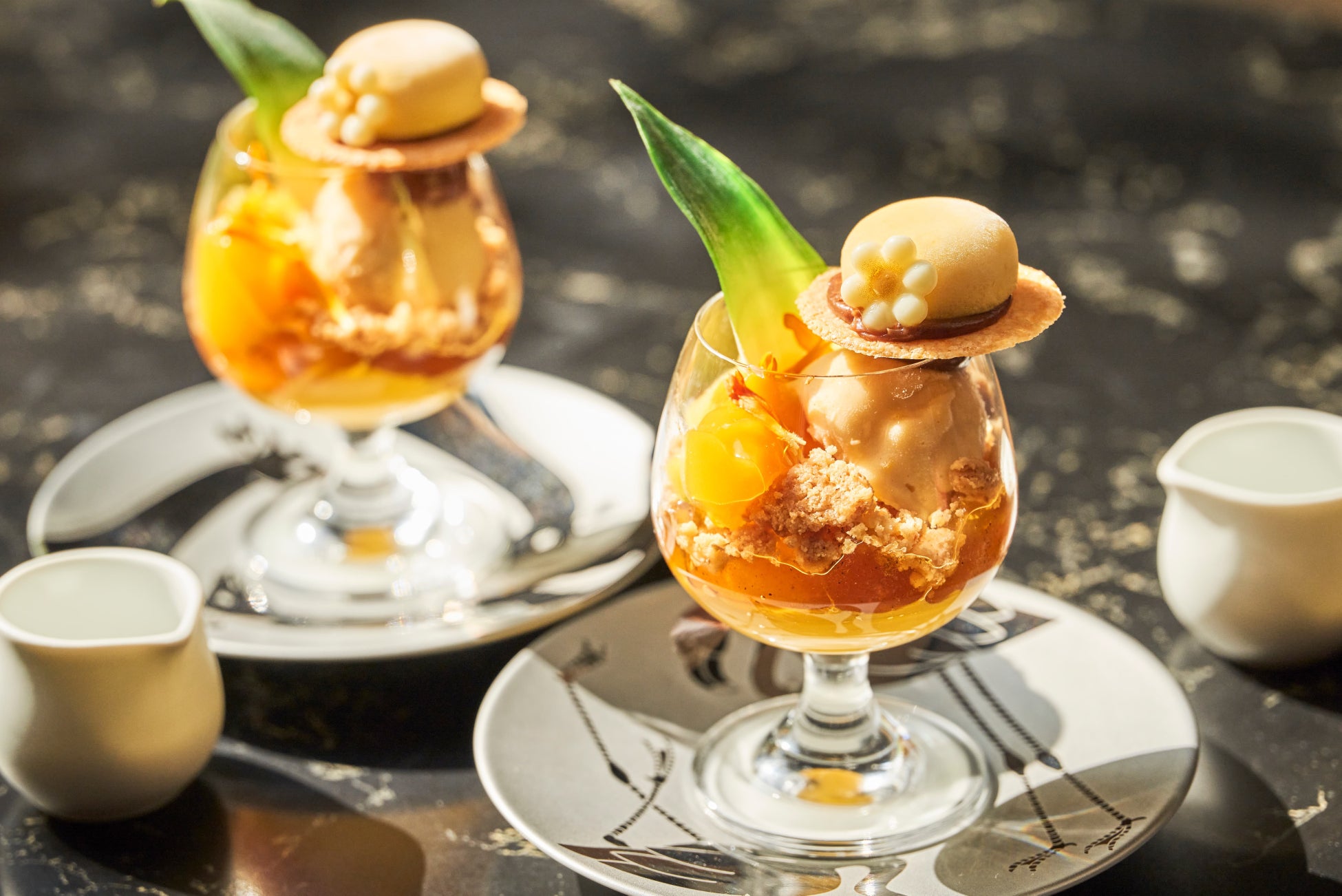 マンゴーやパッションフルーツの華やかな香りと、日本三大発酵茶の阿波晩茶のジュレや、ヴィーガンマンゴートマトアイスのひんやり感をご堪能ください。別添えのココナッツ練乳をかけると、さらに濃厚な甘さをお楽しみいただけます。
