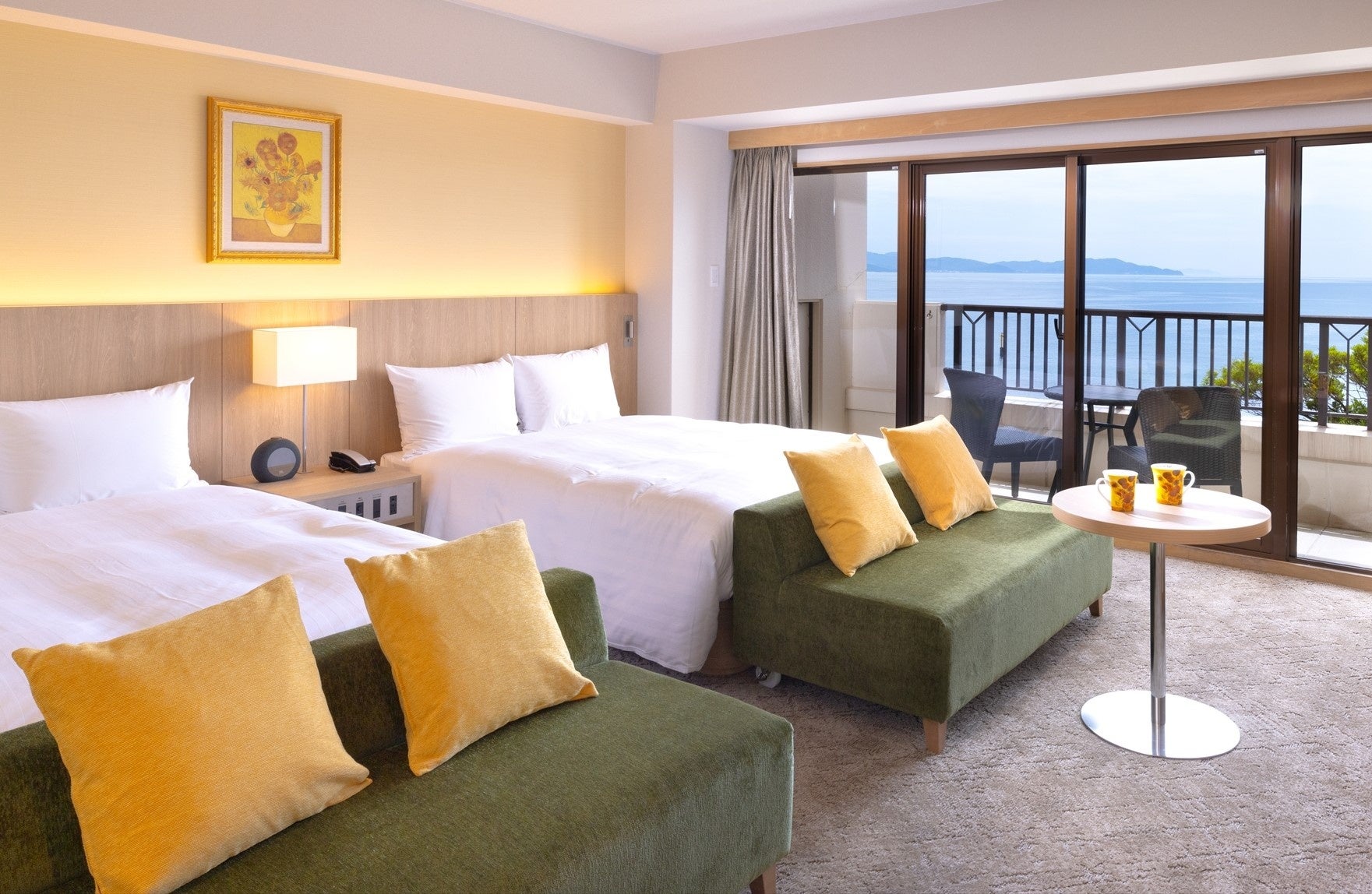 “泊まれるアートギャラリー”として、2024年7月に7部屋誕生。ゴッホにとってユートピアの象徴であるヒマワリを再現した陶板画が彩るアートな空間。バルコニーからは鳴門海峡の絶景を一望できます。