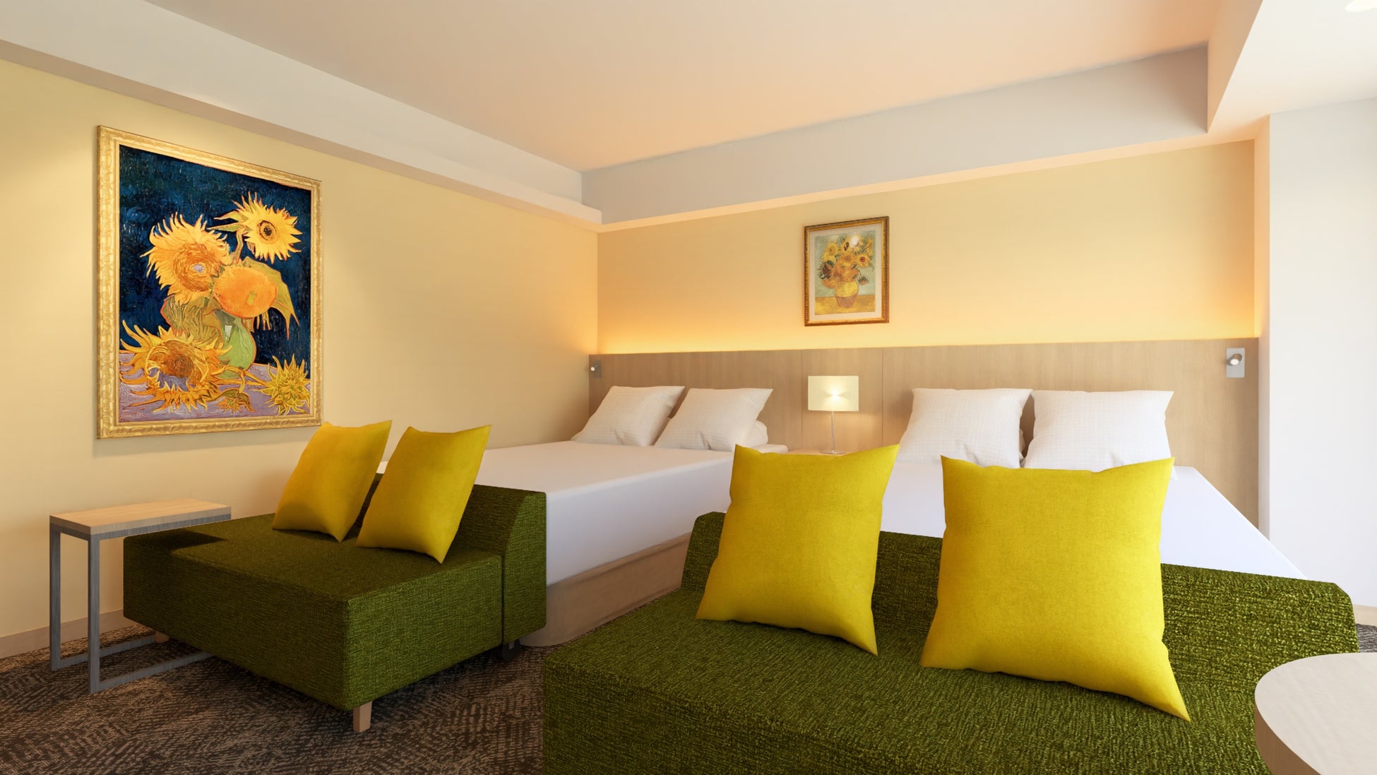 当ホテルは車で約2分の大塚国際美術館とコラボし、昨夏誕生した「ゴッホのヒマワリルーム」が7室。ゴッホにとってユートピアの象徴であるヒマワリを再現した陶板画が彩るアートな客室です。