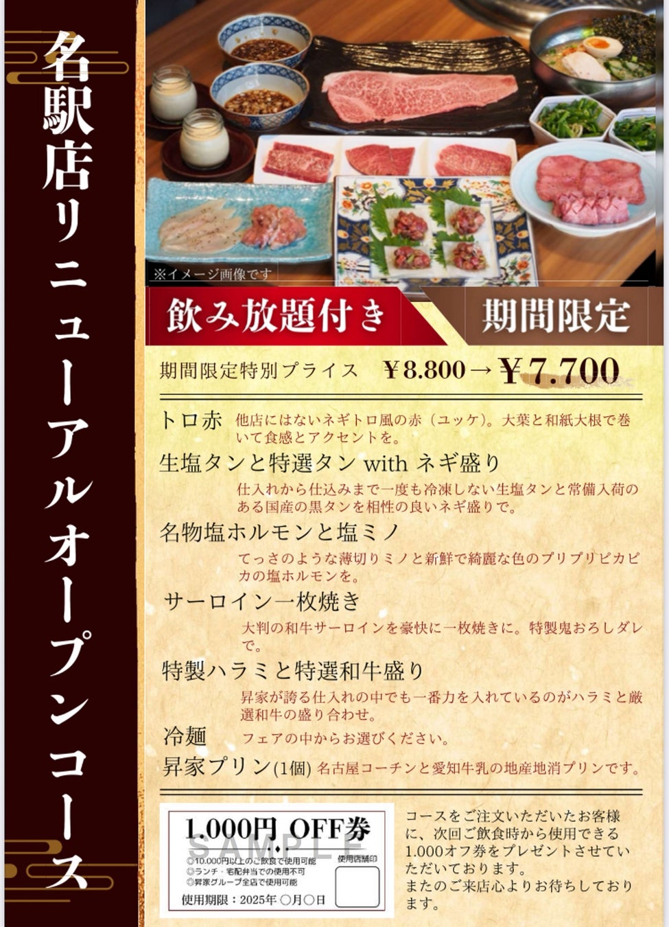 キャンペーン内容:昇家自慢の人気部位を贅沢に堪能できる飲み放題付きの 「名駅店リニューアルオープンコース」 通常価格8,800円のところ、特別価格7,700円でご提供いたします。また、当コースをご注文いただいたお客様には、昇家グループ全店で次回以降のお食事時にご利用いただける 「1,000円オフ券」 をプレゼントいたします。