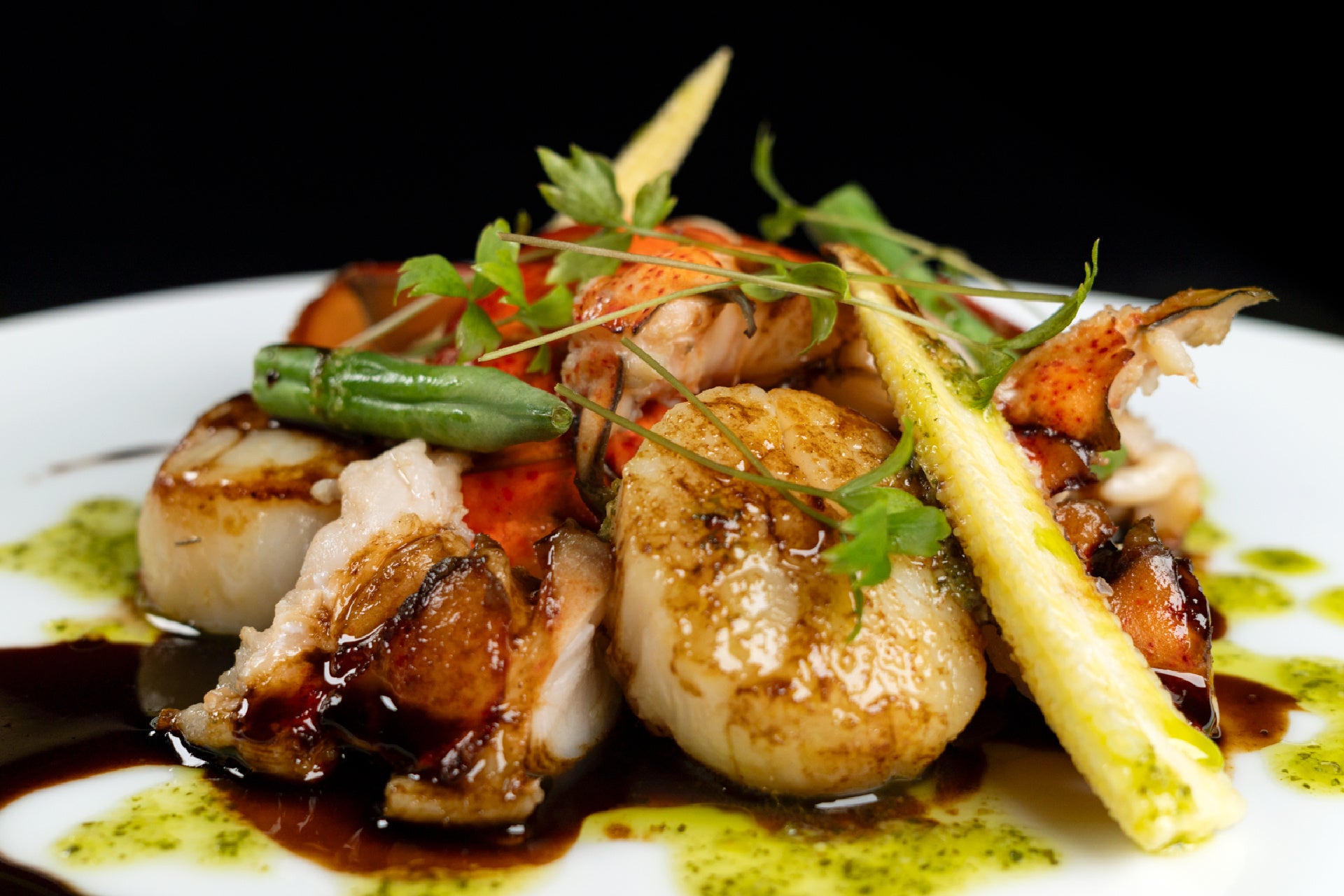 オマール海老と帆立を香ばしく焼き上げ、爽やかなバルサミコとピリ辛のコチュジャンを組み合わせたソースで夏らしい切れ味のあるひと皿に仕立てました。