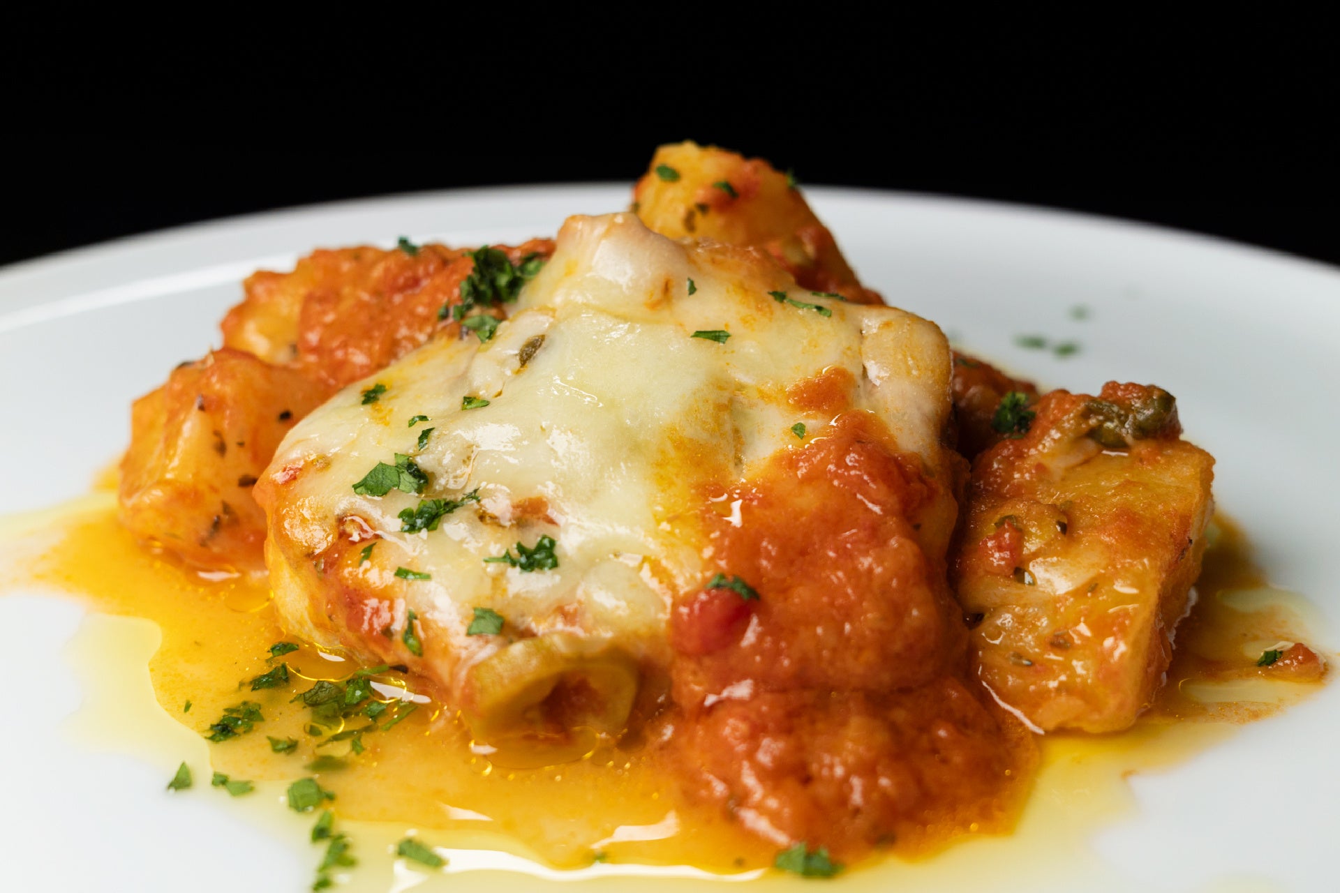 トマトソースとチーズ、ハーブを重ねて、ピッツァ職人の技法を思わせる “ピッツァイオーラ風” に仕立てました。香ばしく焼き上げたメカジキのしっかりとした身質に、ソースの酸味とコクがよくなじみ、豊かな味わいが広がります。