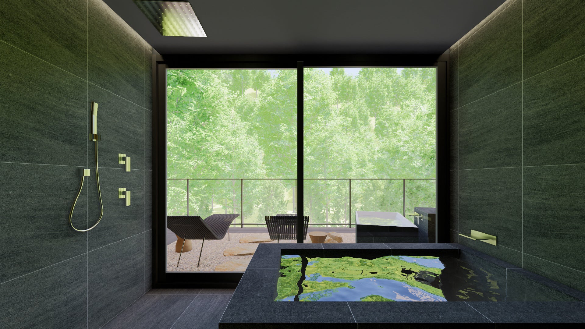 四季折々に合わせて、ゲストがお好みで水風呂とお湯風呂を自由に利用可能です。冬の寒い日には、露天風呂にお湯を張り、内風呂を水風呂に。夏の暑い日には、露天風呂を水風呂にして避暑を楽しめます。また、直結するバルコニーで自然と一体化する外気浴も可能です。