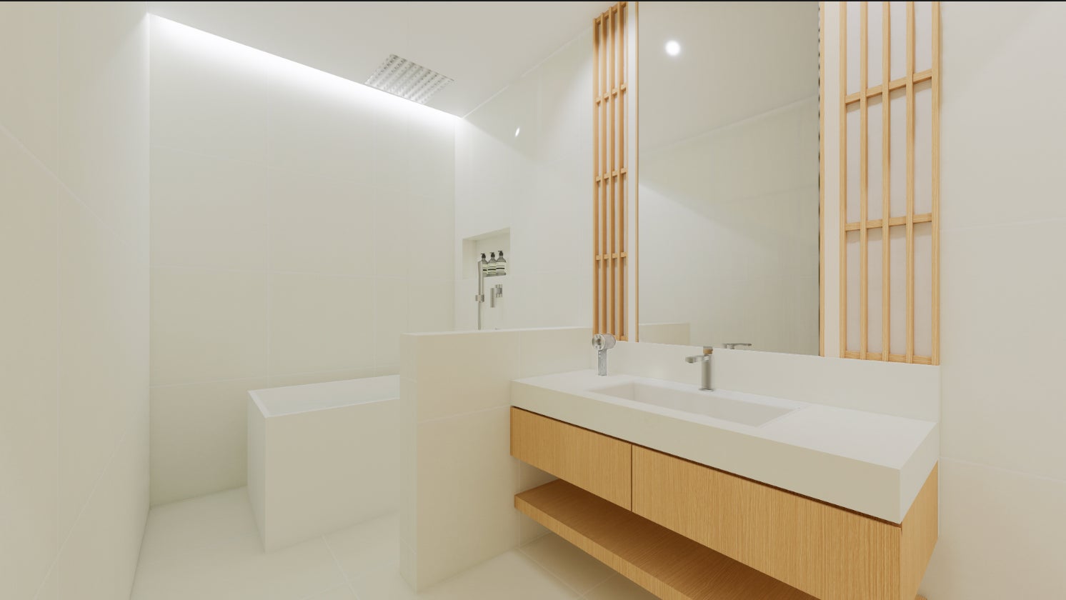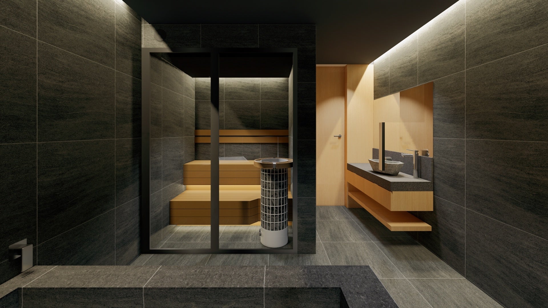 大きく開かれたガラス越しに四季を楽しめるサウナ。ストーブは、HARVIAのCILINDROを採用し、BLACKとNATURALのコントラストデザインで、落ち着いたひと時を過ごせます。隣接する浴室とバルコニーには、どちらでも水風呂として利用可能な内風呂と露天風呂を備え、充実のととのいを実現します。