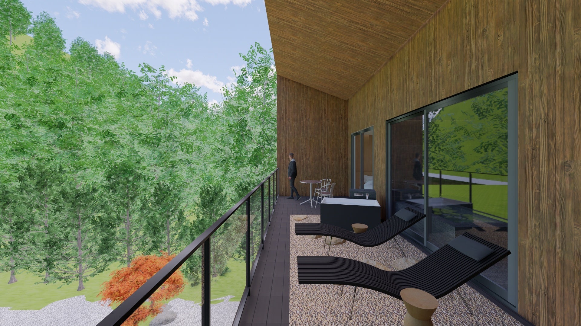 HOTEL SEION FUJIを象徴するバルコニー。横幅10m、最大天井高5mを誇り、サウナ・浴室から自然と一体化するようにデザインされた露天風呂付きの坪庭を完備。TIME & STYLEで統一したラグジュアリーな家具が、特別なひと時をより一層引き立てます。