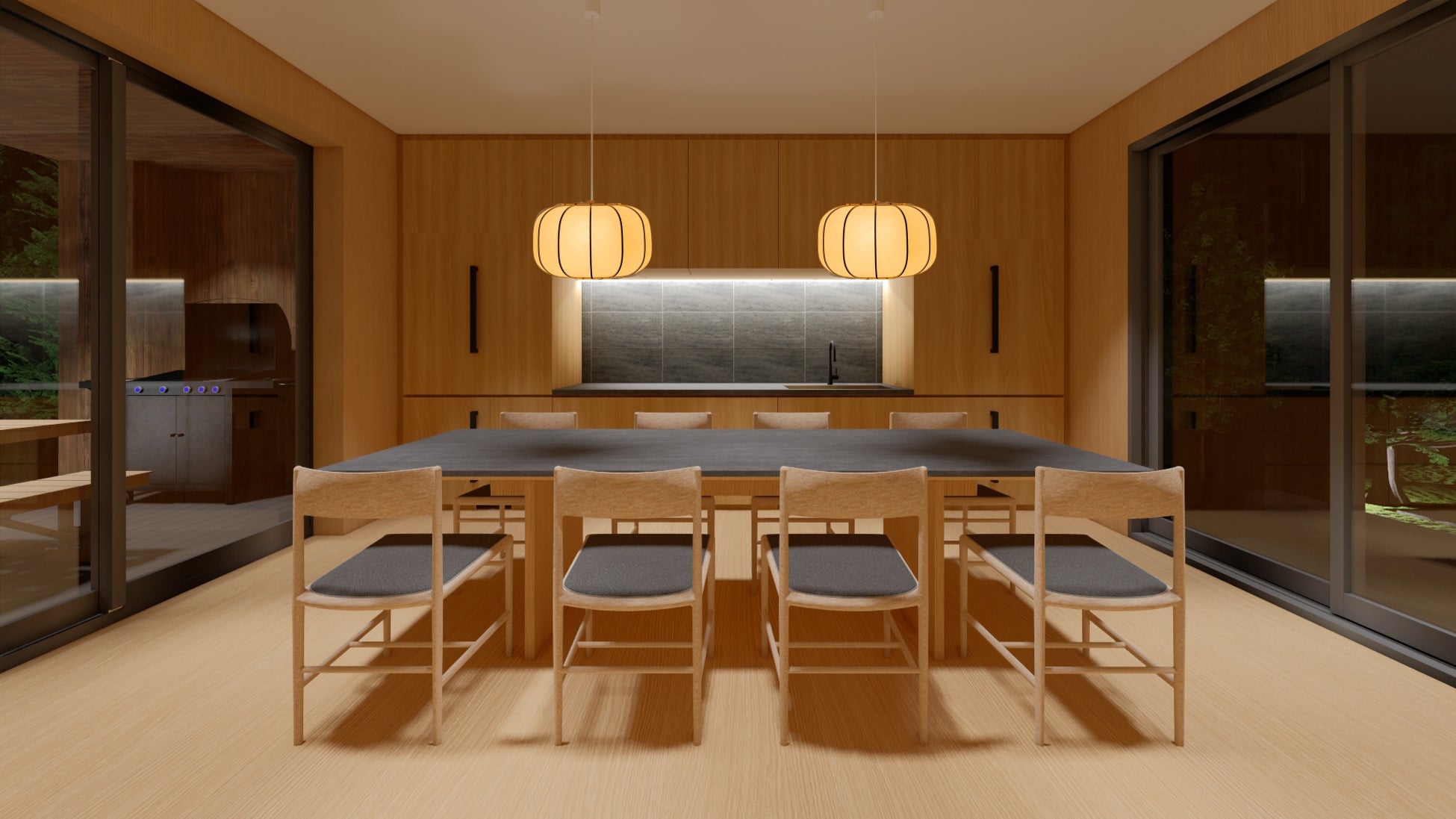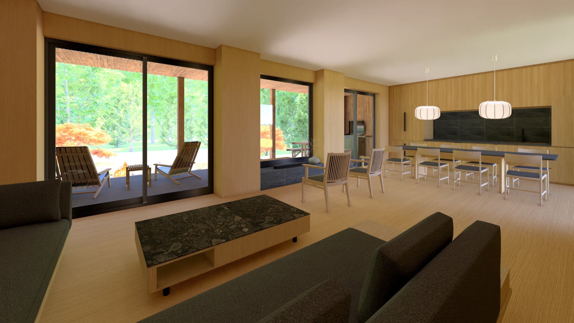 テラスを含めて50畳を超えるリビング・ダイニング・キッチンには、8名での団欒や食事を楽しむことができるソファやダイニングテーブル、造作キッチンを完備。ロゴのモチーフにもなった巨大な丸障子や黒と木目調で統一した家具が和モダンな印象を演出します。また、大開口の窓からは、四季を感じられる日本庭園とその奥へと続く森を一望することができます。