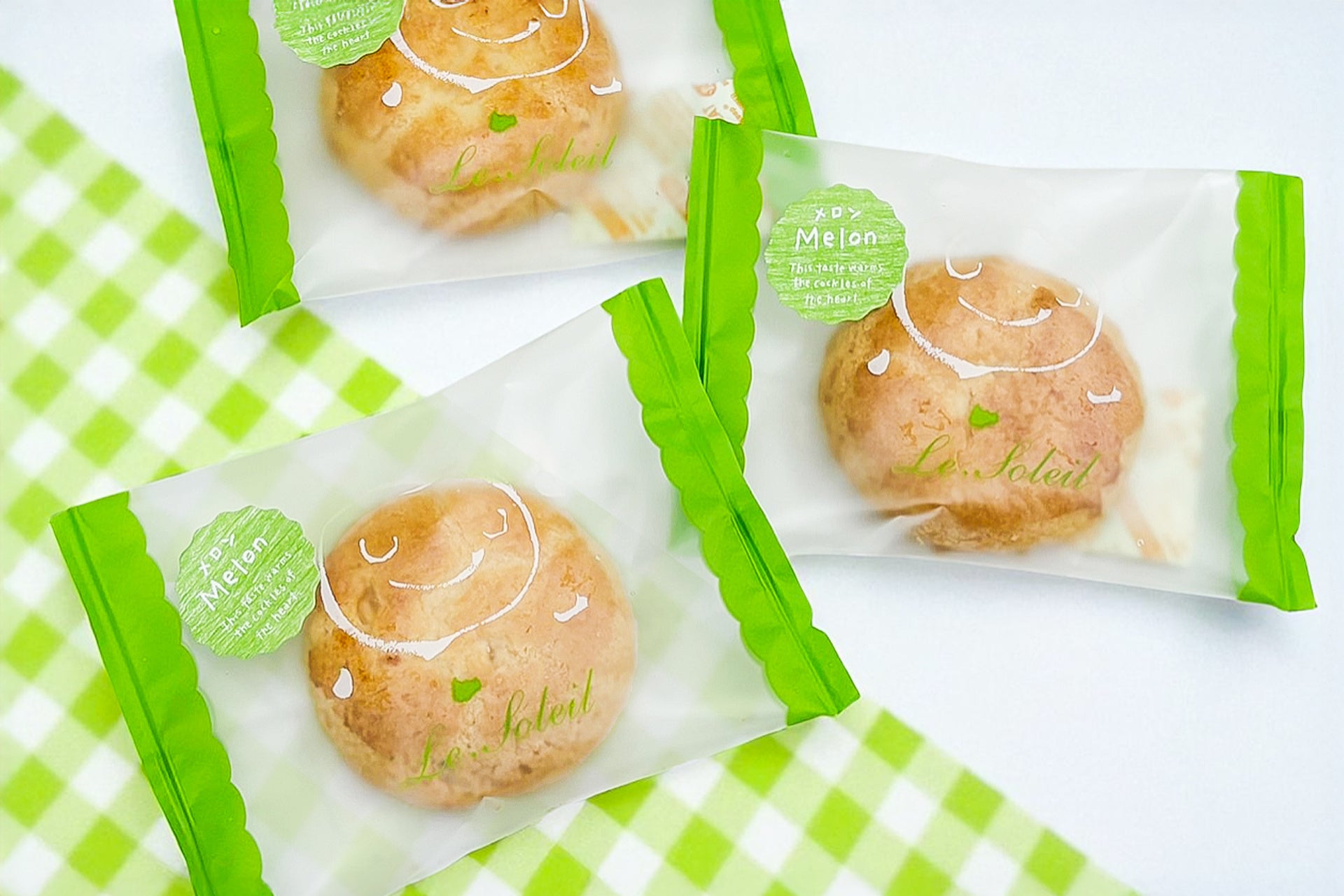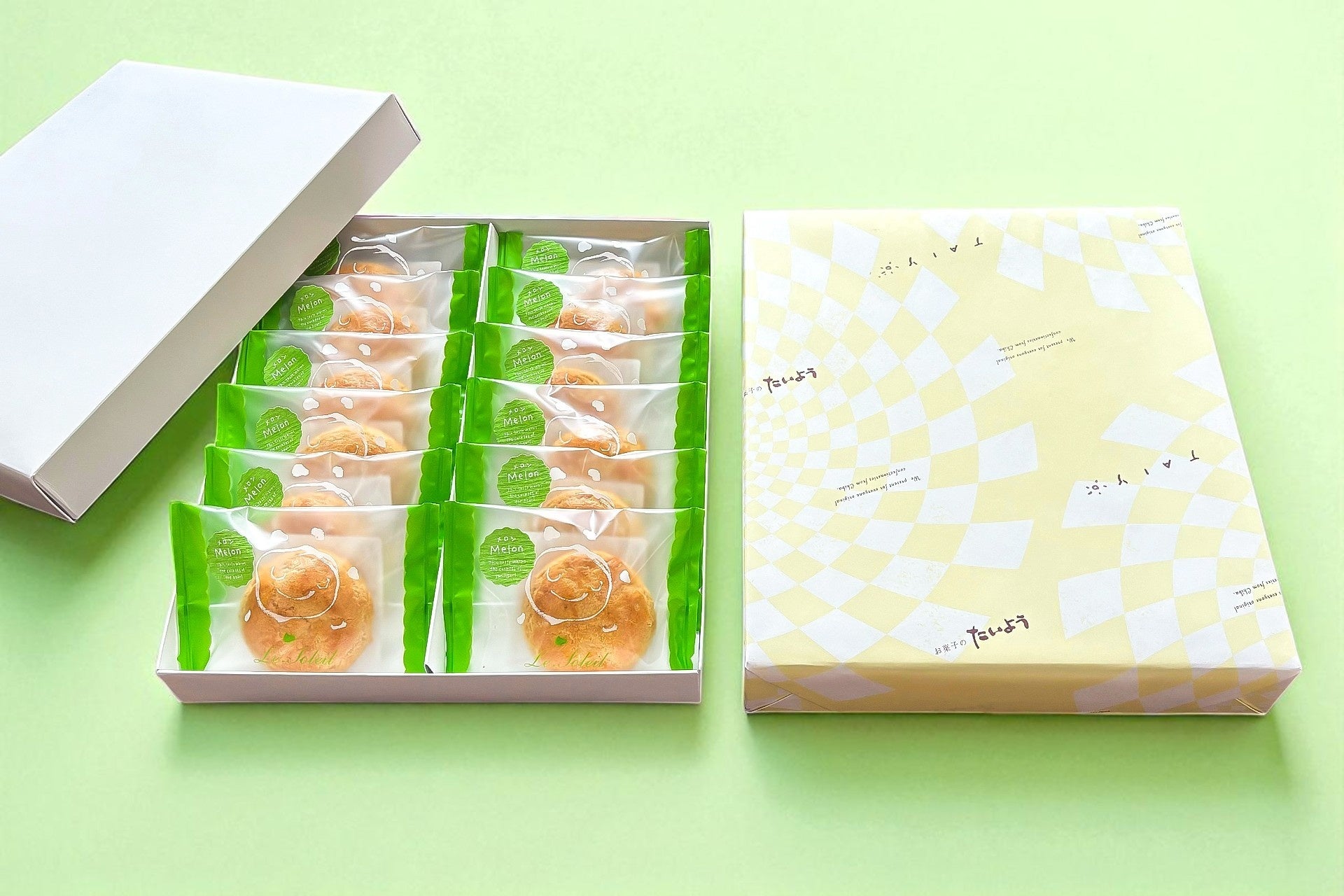 お菓子のたいようオリジナルの大きな太陽のマークと、メロンカラーのパステルなシールが一つ一つに貼られていて、見ているだけで心が躍るような可愛らしいデザインです。