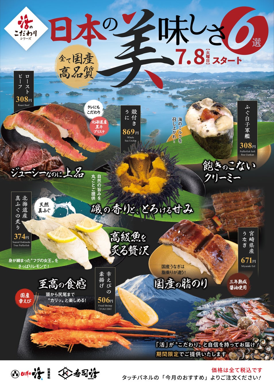株式会社活美登利(本社:東京都品川区、代表取締役社長:土屋秀仁)が運営する「回し寿司活/寿司活」は、運営店舗で7月8日(火)から季節限定おすすめメニューを販売いたします。