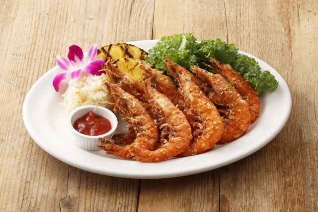 「ポリネシアンソース」で焼き上げたBBQポークリブ(2p)、リブロースステーキ(225g)、テリヤキチキン(150g)、ガーリックシュリンプ(4尾)。ハワイの美味しさを⼀⽫に集めた贅沢なプレート。