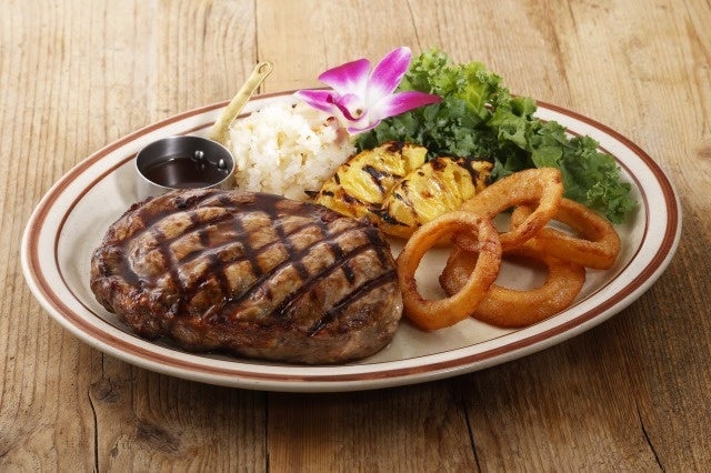 ハワイのグリルには⽋かせないテリヤキソースを塗って焼き上げたリブロースステーキ。オニオンリング、グリルパイナップルと⼀緒にお楽しみください。