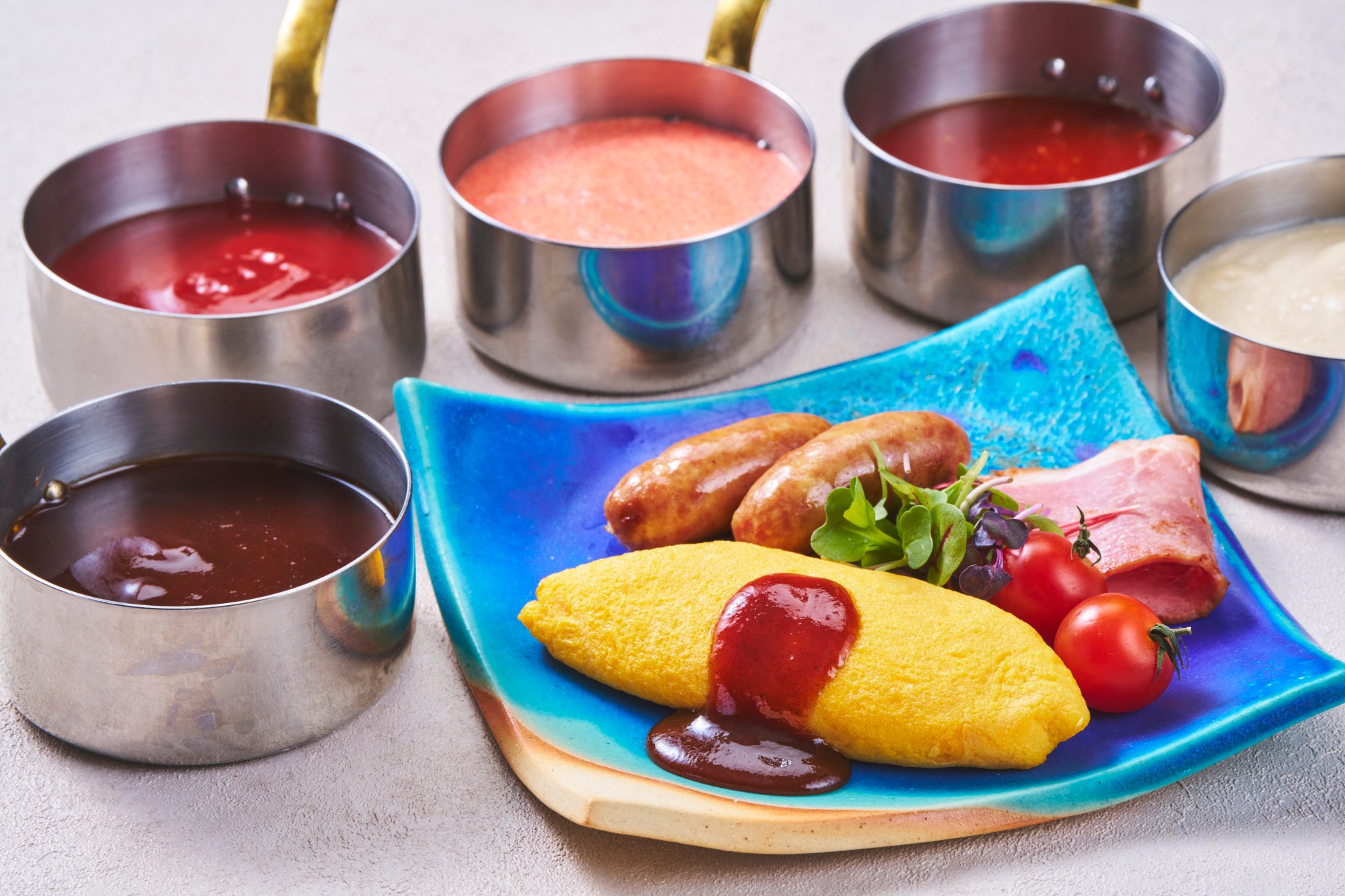 シェフが目の前で仕上げるオムレツは、きのこ、ポークハム、ほうれん草、チーズなどの具材に加え、ケチャップ、チリソース、明太子ソース、ホワイトビーフソース、テリヤキソースといった多彩なソースからお選びいただけます。ふわとろ食感と香ばしさが魅力の出来立てをお楽しみください。さらに、シェフオリジナルレシピのソーセージは、塩と砂糖の配分をグラム単位で調整することで、よりジューシーな食感に仕上げました。香ばしく焼き上げた厚切りベーコンとともに、お召し上がりください。