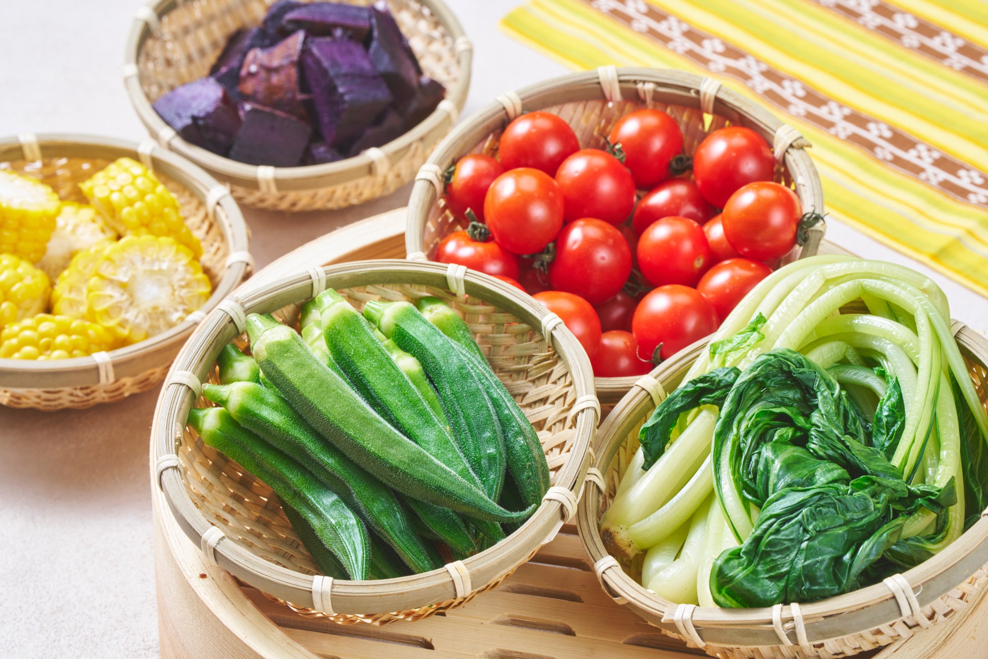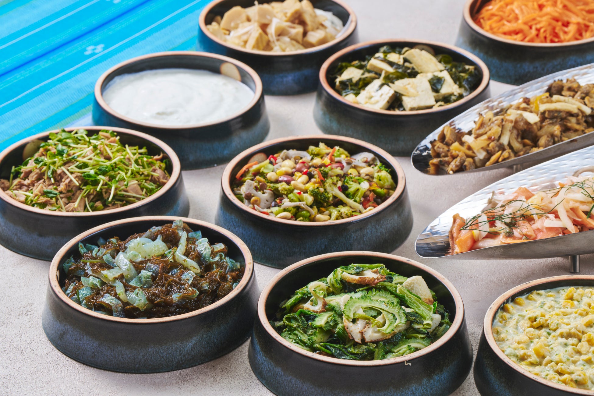主に沖縄県産野菜を使用したサラダコーナーでは、サニーレタスやグリーンリーフ、紅芯大根など、彩り豊かな葉野菜を中心にご提供いたします。さらに、スチーム調理で仕上げた島野菜などの温野菜もご用意し、食感や風味の違いをお楽しみいただけます。また、アセロラ、パイナップル、ゴーヤーを使った自家製ドレッシングに加え、ナッツやシード、ドライフルーツなどのトッピングも15種類ご用意。お好みに合わせて、自分だけのヘルシーで贅沢なサラダをご自由にカスタマイズしてお召し上がりください。