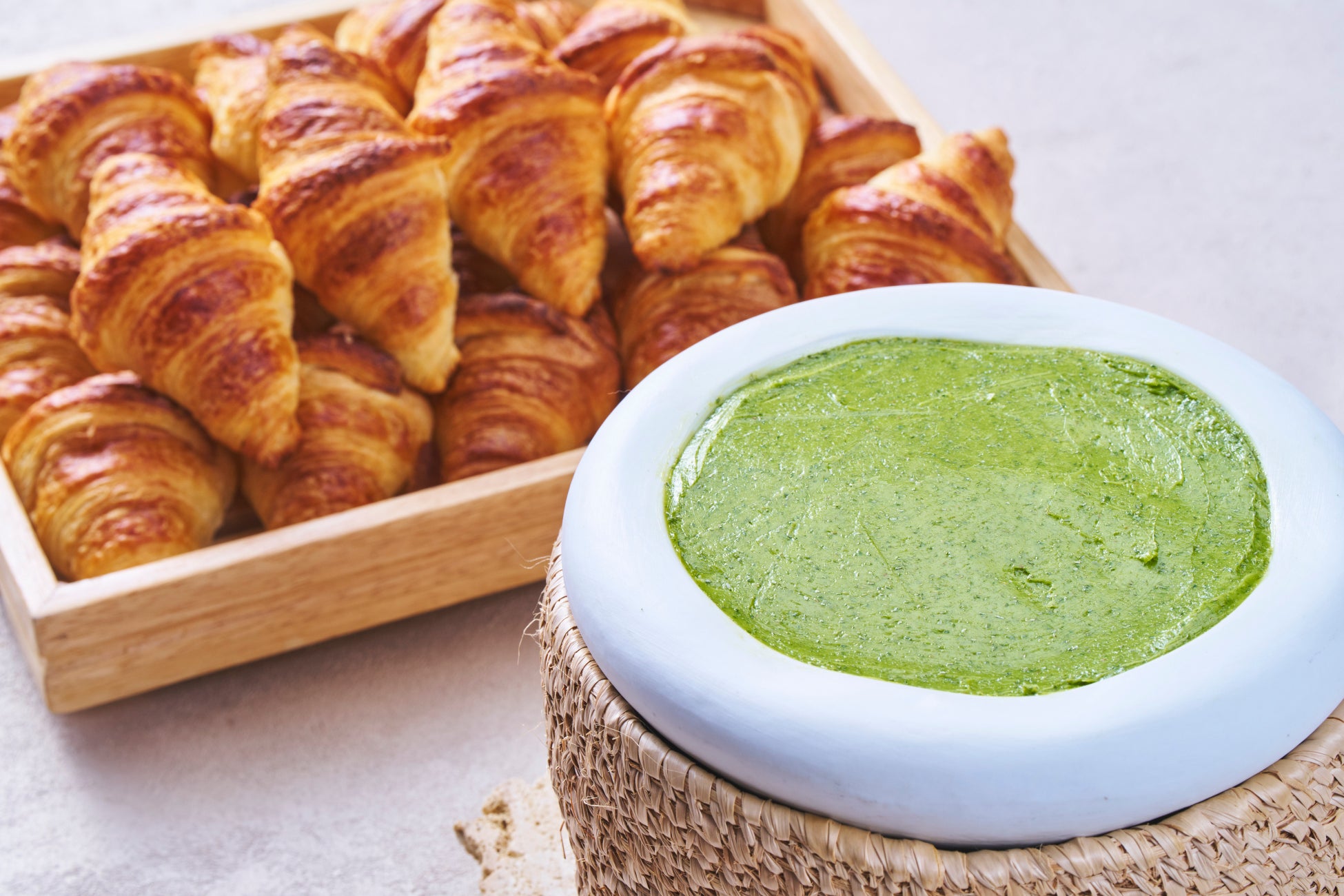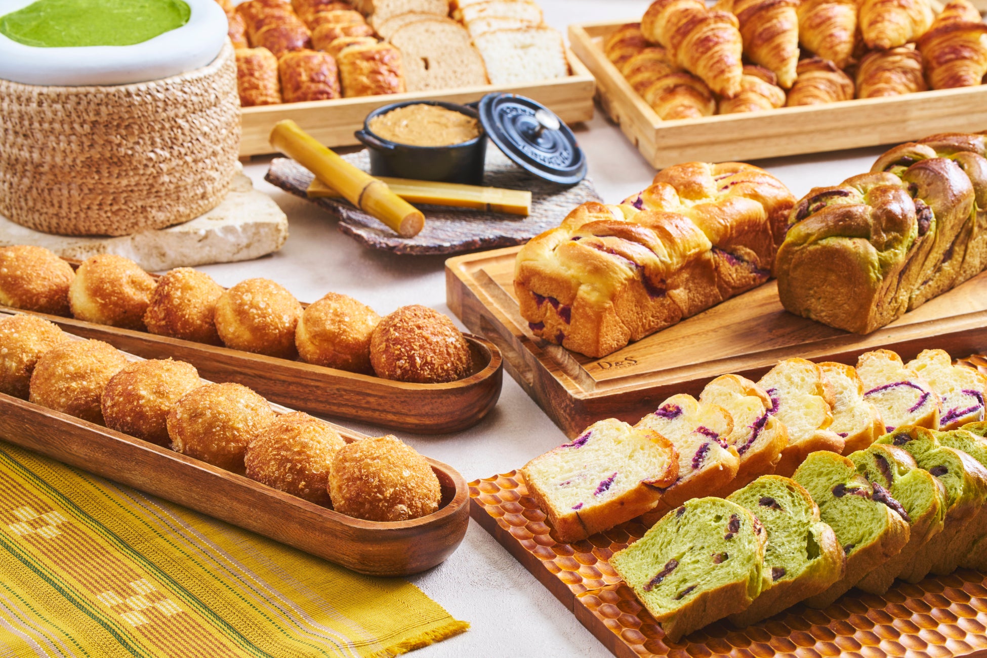クロワッサンやパン・オ・ショコラ、米粉パンなどの定番に加え、紅芋や抹茶小豆を使ったブリオッシュなど、沖縄らしさを感じるパンもラインナップ。さらにおすすめは、アグー豚を贅沢に使用したもちもち食感のカレーパン。マンゴーを隠し味に加えることで、旨味と甘みが絶妙に調和した特別な一品に仕上げました。トッピングには、黒糖ピーナッツバターや、シェフオリジナルレシピの月桃(げっとう)バターをご用意。甘く爽やかな香りが特徴の沖縄県産・月桃を使ったバターは、なめらかでコクのある味わいが魅力です。