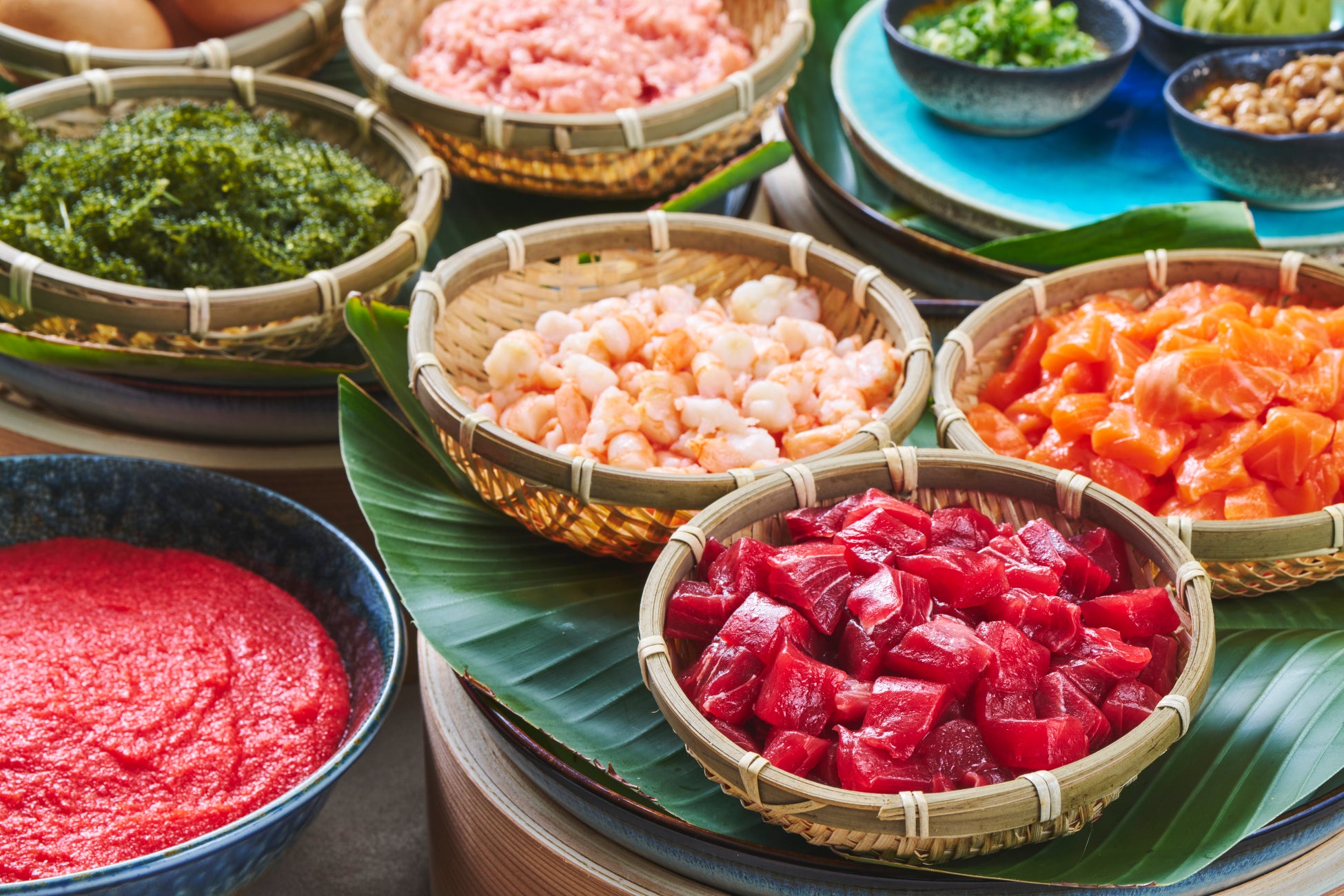 マグロ、サーモン、エビ、海ぶどうなどの新鮮な海の幸に加え、